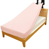 タテヨコに伸びるストレッチ素材の のびのびシーツ。敷布団で使用の時はのワンタッチシーツとして、ベッドのマットレスにかける時はベッドシーツとして1枚で2通りのパターンに対応します。