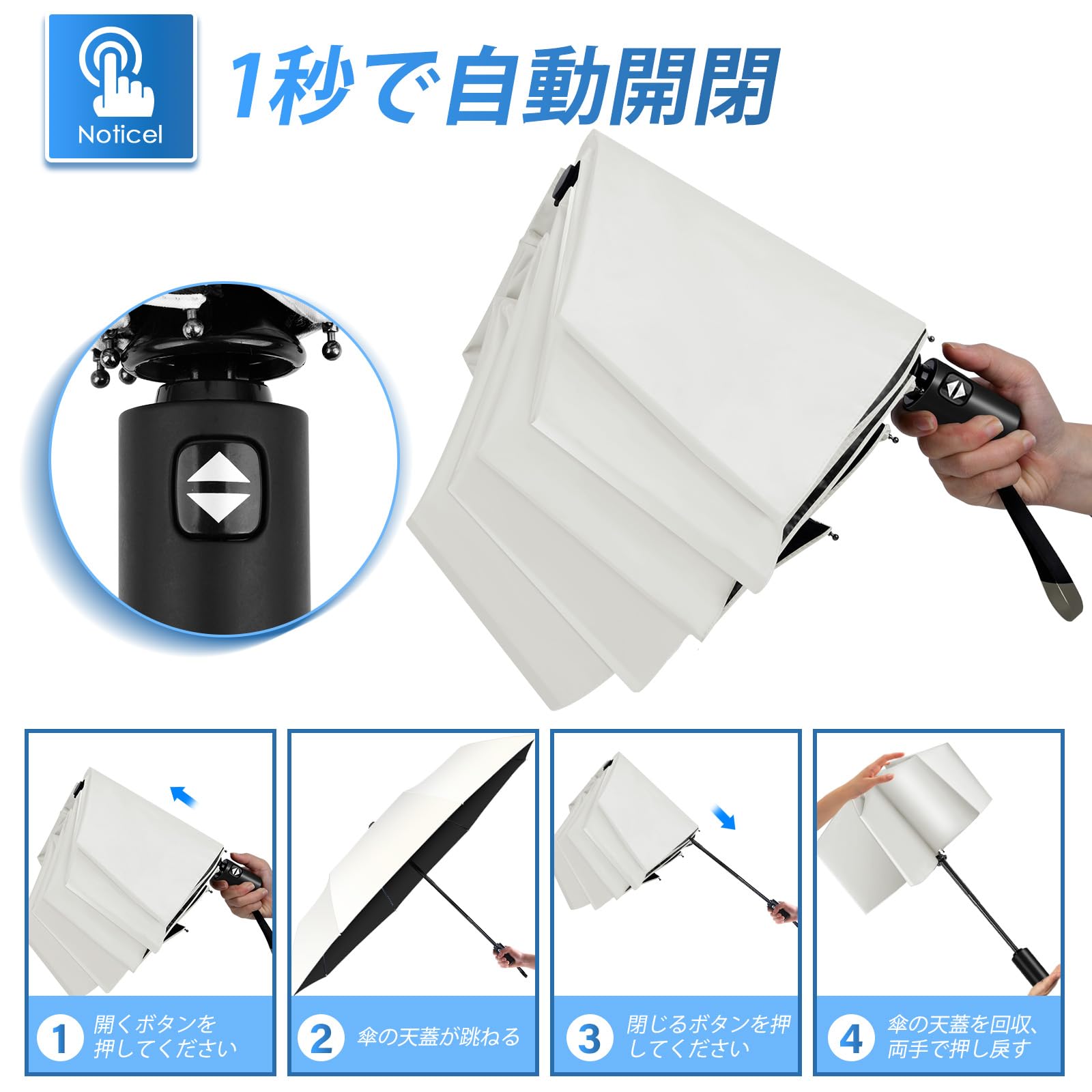 【ワンタッチ自動開閉】当社の傘は、片手で簡単に操作できるフルオートシステムを搭載しています。ボタンを押すだけで傘を開閉できます。持ち運びが便利で、場所を取らず、男女兼用で、旅行やアウトドアに適しています。傘布は高密度のポリエステル素材採用、表面テフロン(Teflon)撥水コーティング施され、豪雨の中でも体が濡れることはありません。傘を閉じた後、軽く振るだけで、水滴が簡単に振り払えます。電車内等の公共の場では人にご迷惑を掛けません。また防汚効果もあり、汚れにも強い生地です。