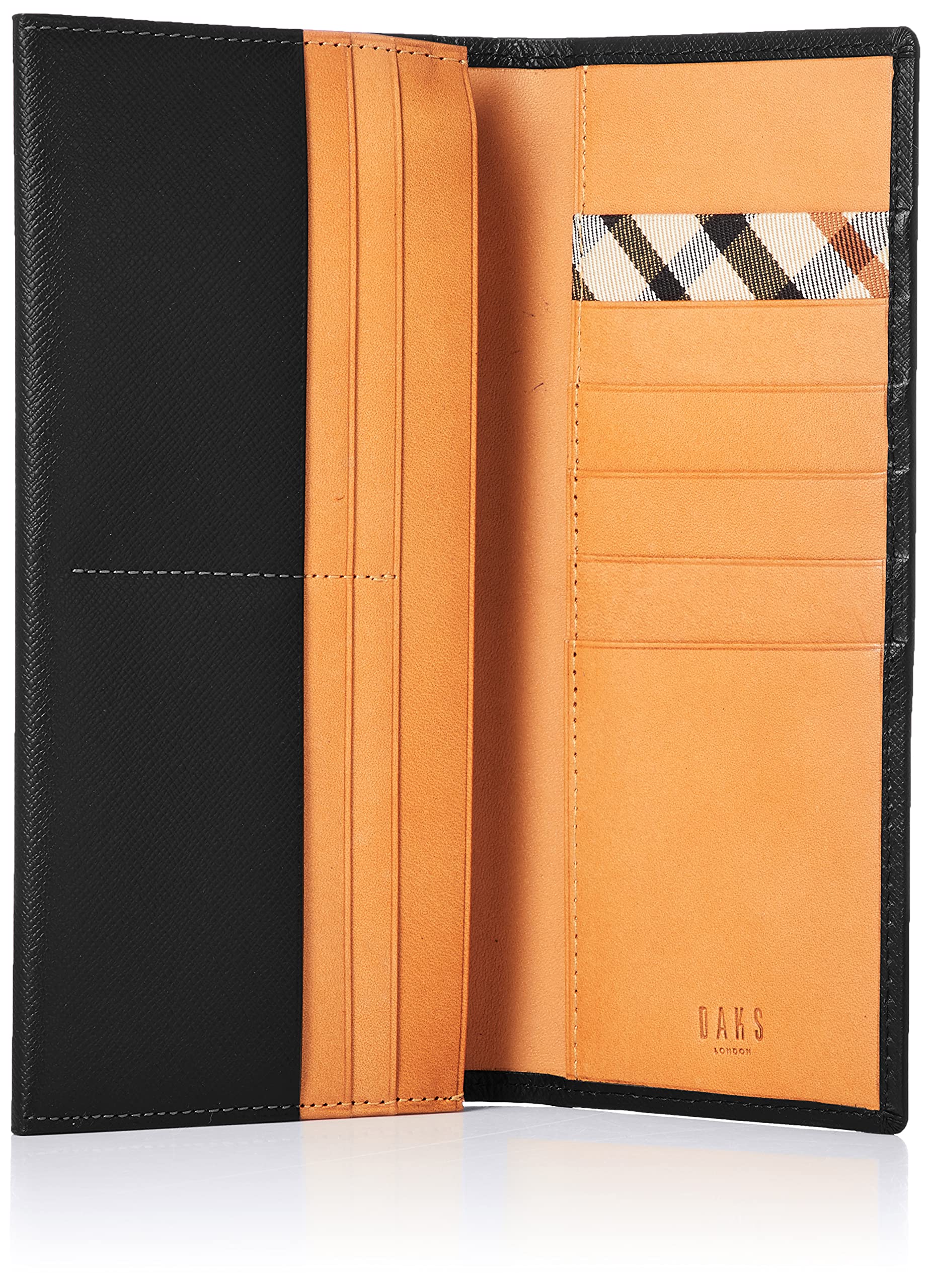 DAKSは信頼あるブランドの証としてエリザベス女王、エジンバラ公、チャールズ皇太子からロイヤル・ウォラント(王室御用達認定書)を授与され、この3つの紋章を掲げることを許されています。120余年の歴史を持つDAKSは、次世代に向けてさらなる進化を目指すと共に、受け継がれた伝統と遺産を強い絆をもって継承し、新たな未来へ向かいます。 美しく輝く上品な光沢を放つエンボス革を使用、内作りには革本来の持つ力強い存在感をそのまま表現した植物タンニン仕上げのヌメ革を使っています。遊び心を演出するハウスチェックのカード段。気品溢れる表のDDロゴがアクセントになっています。