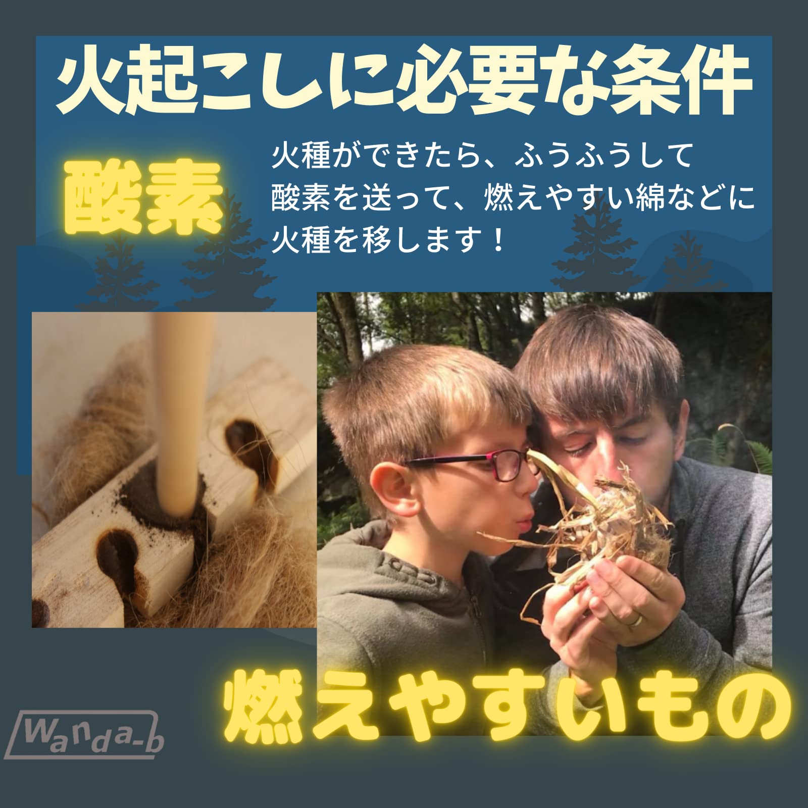 火起こしに必要な道具を揃えましたが、これだけでは火を起こすことはできません。 火を起こす条件として、1.酸素 2.熱 3.燃えるものが必要です。