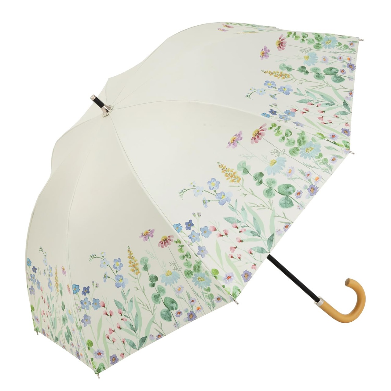 リーベンオリジナル1級遮光日傘<クールプラス> 遮光率99.99%以上、UVカット率99.9%以上、遮熱効果のある機能性生地を使用。傘生地に花柄模様をあしたったおしゃれな日傘。中棒スライド式で使う時はゆったり、しまう時はコンパクト。内側はブラックで地面からの照り返しを吸収し、顔への照りの集中を防ぎます。 ■サイズ:親骨50cm×8本骨 全長:約73cm 収納時全長:64cm 開傘時直径:約81cm 重さ:約260g ■タイプ:晴雨兼用傘 スライド式長傘 手開き傘 ■傘骨カラー:親骨ブラック・中棒ブラック ■留め布タイプ:スナップボタン(凹凸) ■素材 生地:ポリエステル100%(ポリウレタン加工) 親骨:グラスファイバー 中棒:アルミニウム 手元:木 ■原産国:中国 ■品番:1701