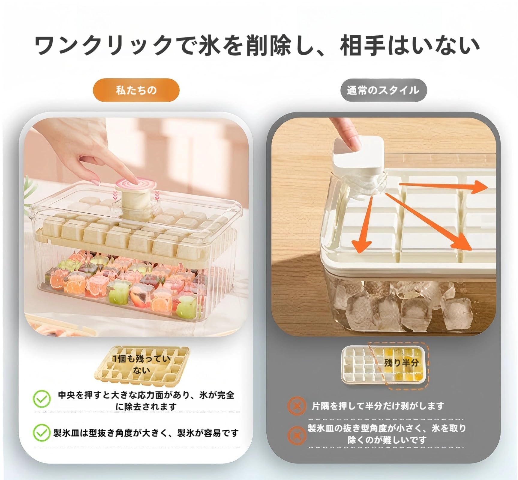 ワンプッシュで簡単取れる氷:この製氷器、中央押しデザイン採用で、叩いたり手で剥がす必要がなく、軽く押すだけで64個の角氷が簡単に取り出せます。滑り止めアイススクープと密閉蓋付きで、手が濡れず衛生的
