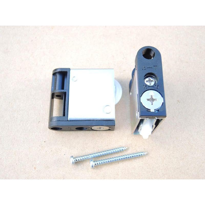 扉の横から縦と横方向にビス留め固定するタイプのソフトクローズ用と連動引き戸用Y型レール対応の引き戸用及び収納3連引き戸用の戸車です。横方向にビス1本で固定します。本体は金属樹脂混合です。