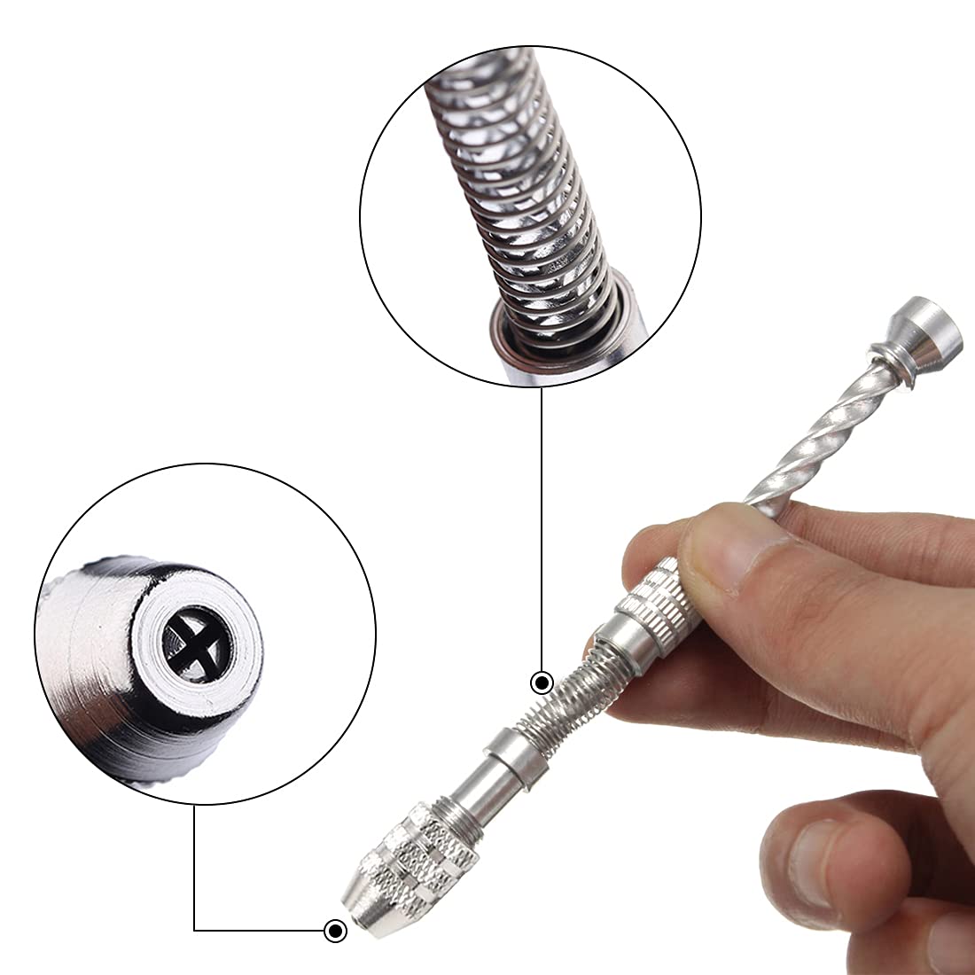 使用簡単:適合するサイズのドリル刃を選べ、ハンドドリル先端を緩める。ハンドドリルの先端にチャックを取り付け、クロス溝にドリルビットを挿入します。穴を開けたいことろに印をつけ、本体のお尻の部分を手のひらに当てて固定、人差し指と親指でピンバイスを回す。