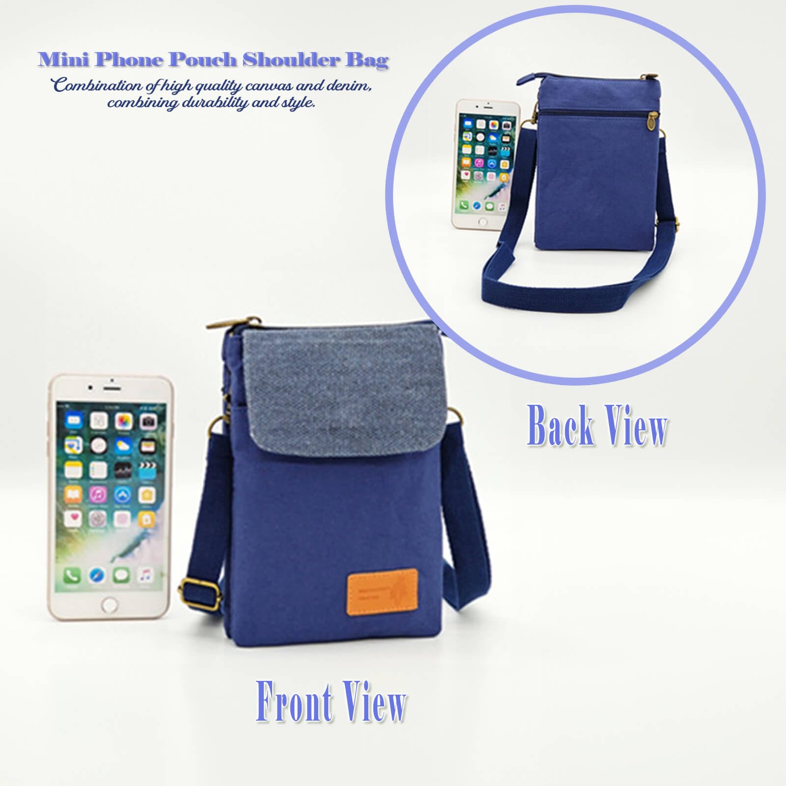 サイズ: 横19.5cm×高さ13cm×幅2cm、重量:約120g。素材:高品質帆布とデニムを組み合わせ、耐久性とスタイルを兼ね備えています。このショルダー スマホポーチは、特にレディース向けにデザインされています。
