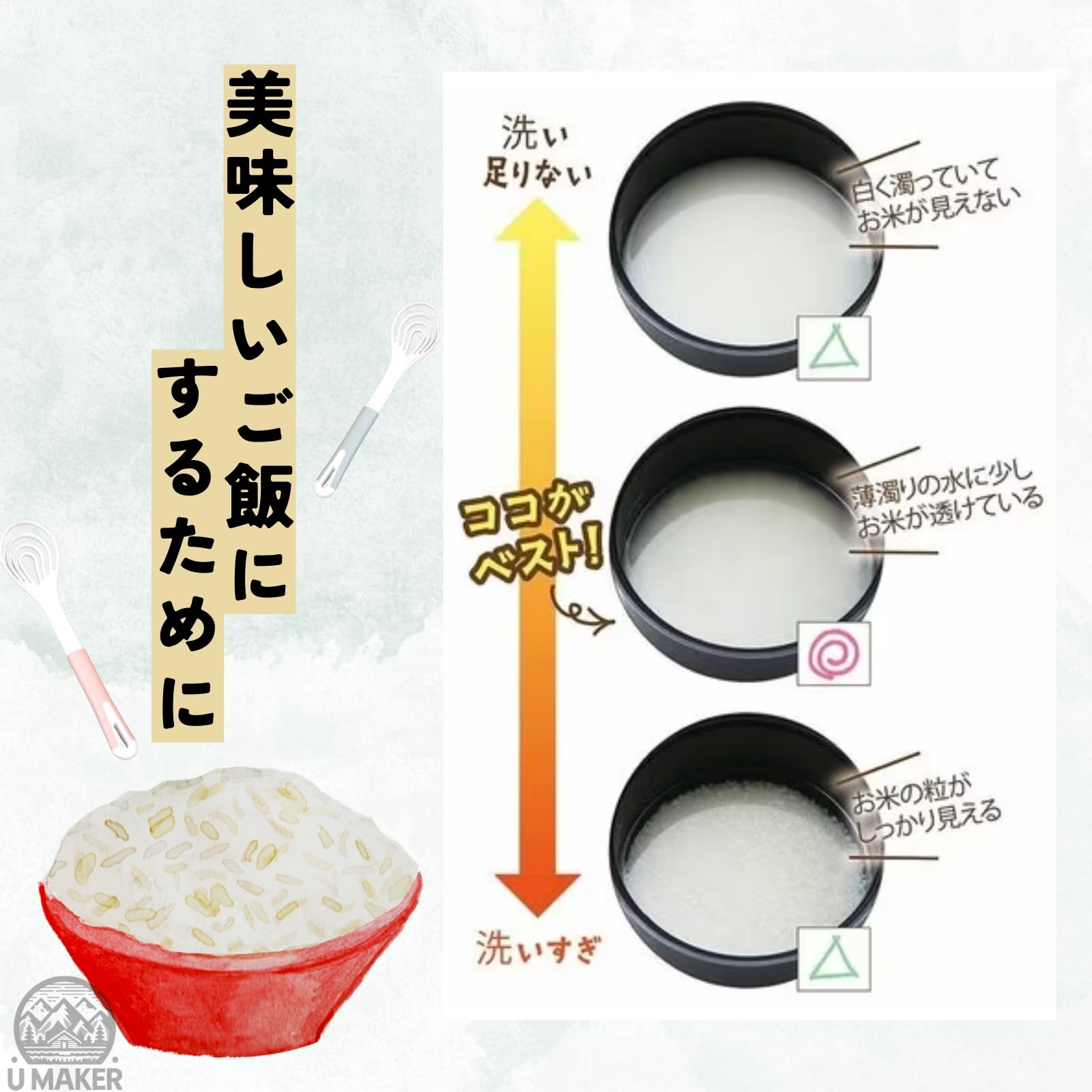 水仕事が苦手な方や、美しいネイルを守りたい方に最適です。この米洗い棒は、冷たい水に直接触れることなく、お米を優しく、かつ効率的に洗うことができます。独特のスプーン形状がお米を保護しながら、軽い手の動きで簡単に洗米を可能にします。 さらに、このツールは多機能で、泡立て器としても活躍。手作りの生クリームやお好み焼きの生地作りにも役立ちます。一つで二役を果たす便利さを、ぜひご体験ください。 【簡単な使用方法】 お米を入れたボウルに水を加え、このスティックで軽くかき混ぜるだけ。お米の汚れを手早く落とし、水を捨てること数回で、ふっくらとした美味しいお米が炊き上がります。