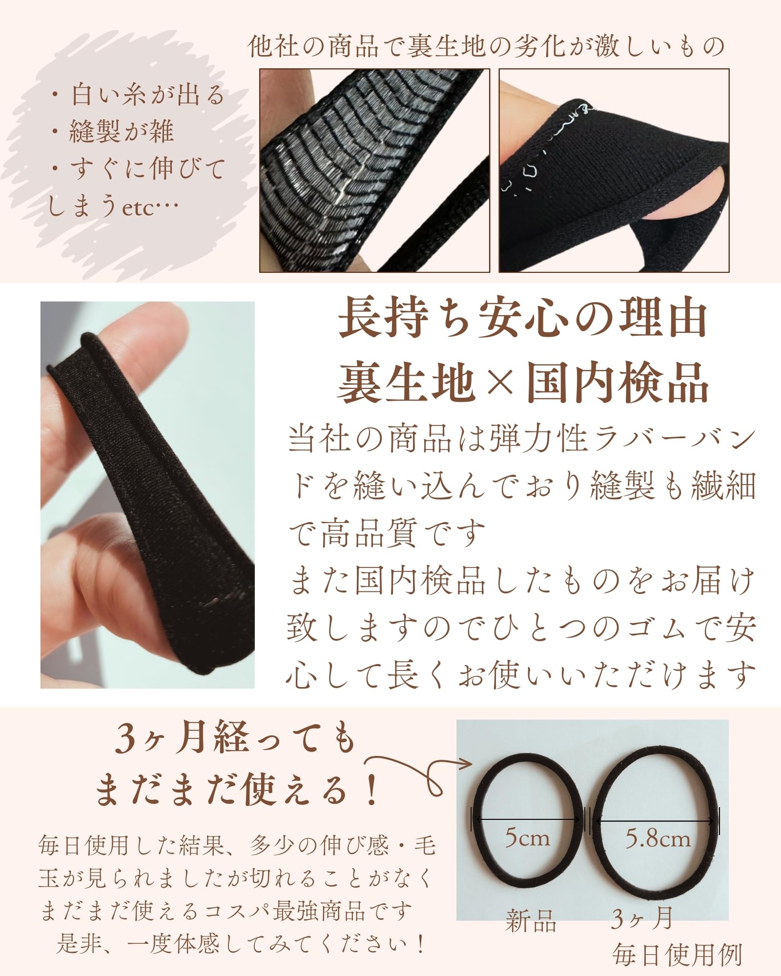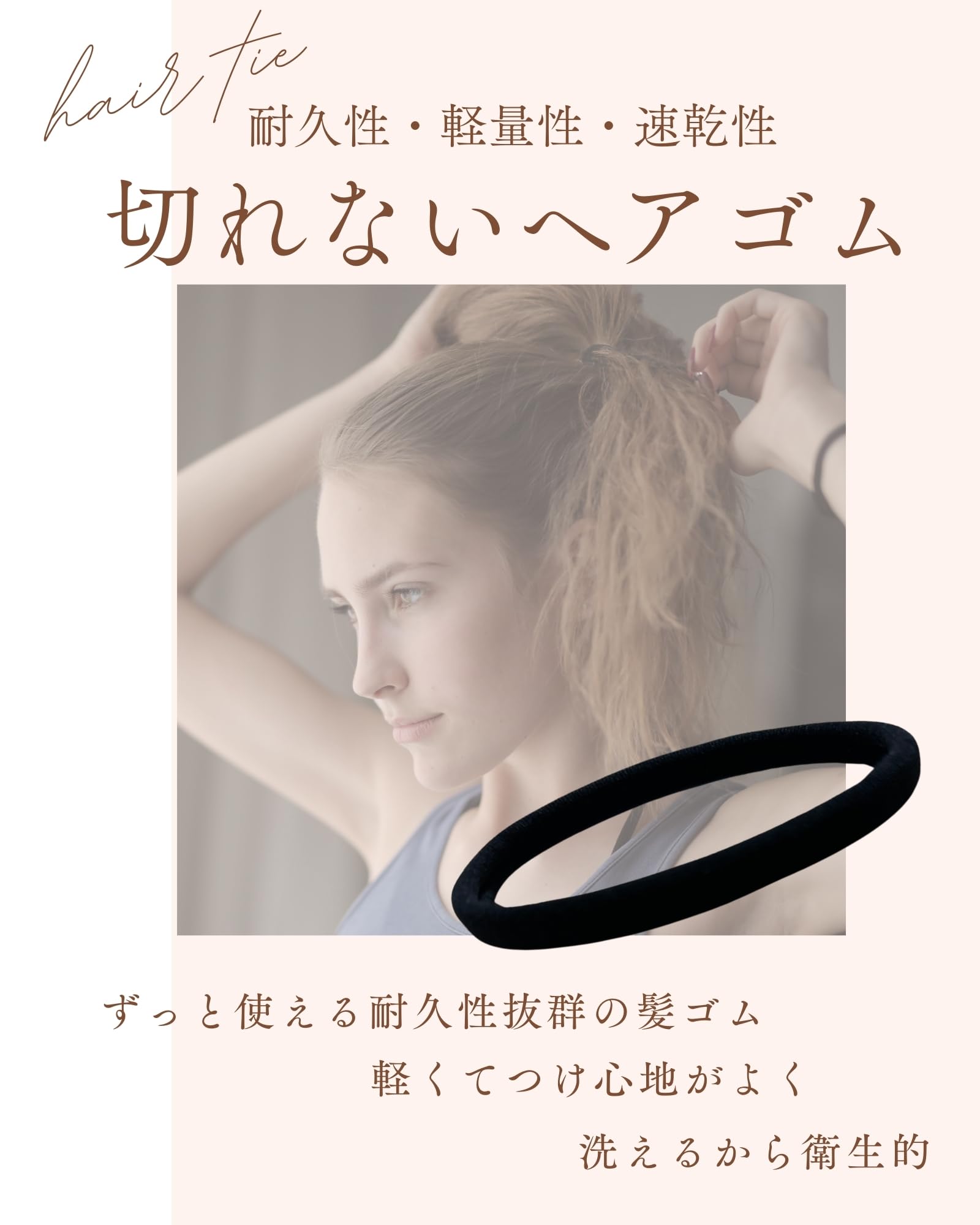 『切れない洗えるヘアゴム』弾力性の高いラバーバンドを使用し、繋ぎ目のない一体型の布仕様なので切れずに長持ちします。ポリエステル素材で水や湿気に強く、速乾性も高いため、汚れたら何度でも洗える耐久性のあるヘアゴムです。
