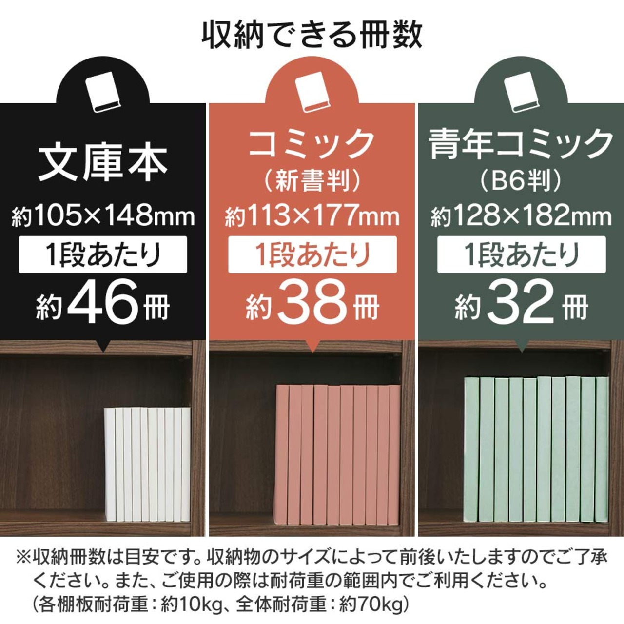 可動棚付きだから、文庫本から青年コミック(B6判)まで、サイズに合わせてすっきり収納できます。