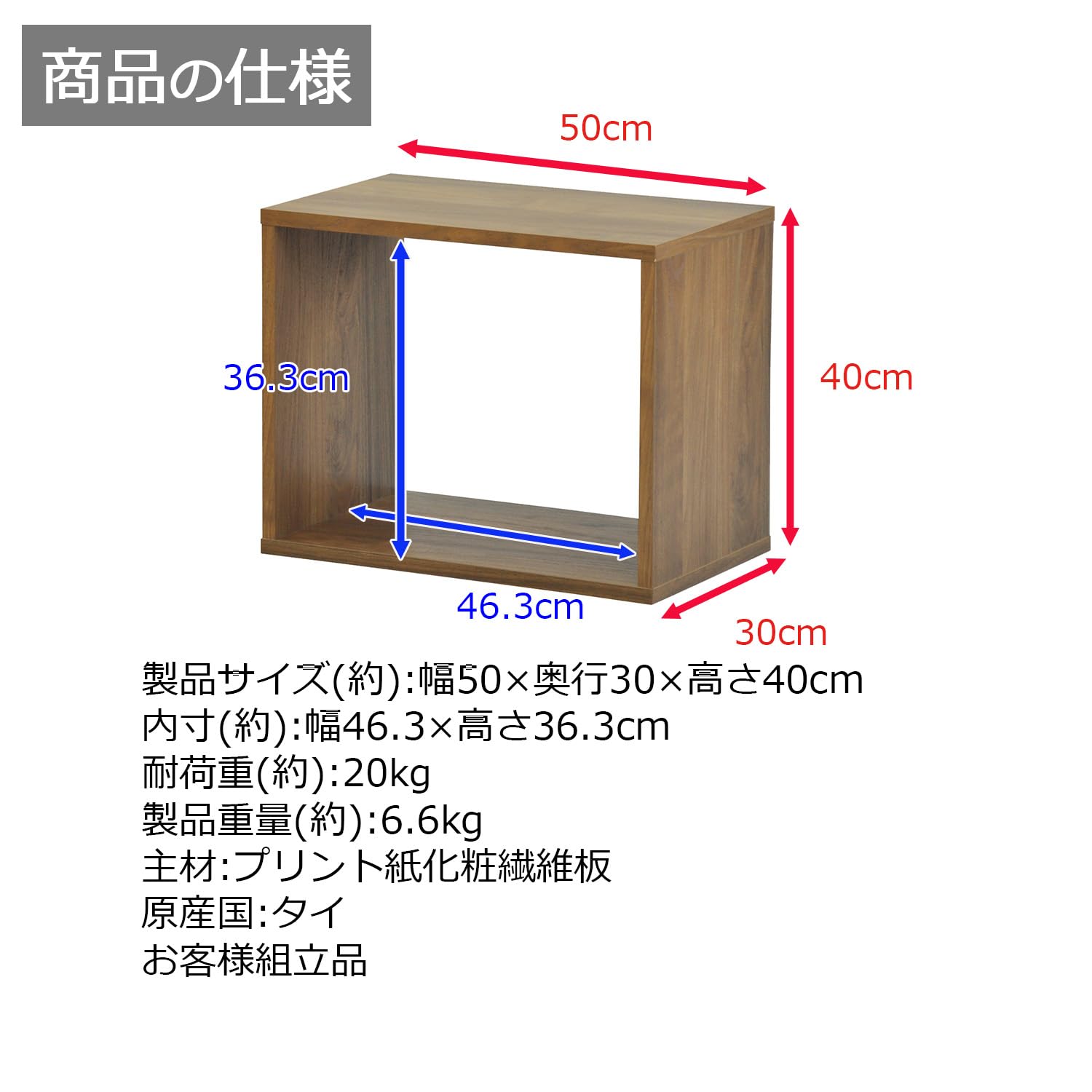 商品サイズ(約):幅50×奥行30×高さ40cm、板厚:1.8cm、内寸(約):幅46.3×高さ36.3cm