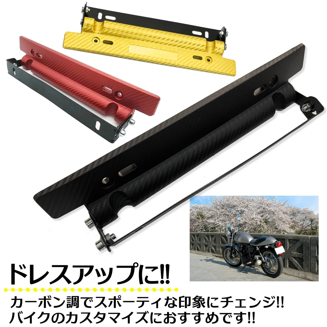 カーボン調のデザインを採用し、見た目にも高級感を演出できるナンバープレートステーは、ブラック、ゴールド、レッドの3色展開で提供しています。お好みのカラーを選ぶことで、愛車のカラーリングやカスタムスタイルに合わせたコーディネートが可能です。サイズは全長約320mm、取付幅33mmとなっており、多くの車種に対応する汎用品です。