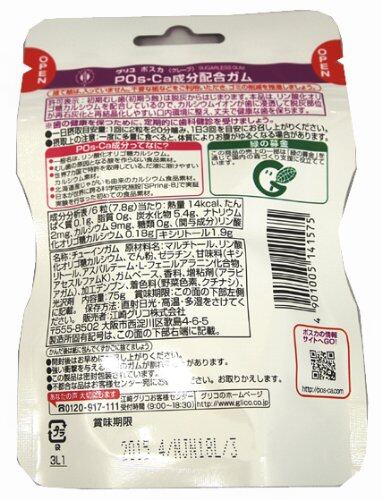 原材料:マルチトール、リン酸化オリゴ糖カルシウム、でん粉、ゼラチン、甘味料(キシリトール、アスパルテーム・L-フェニルアラニン化合物、アセスルファムK)、ガムベース、香料、増粘剤(アラビアガム)、加工デンプン、着色料(野菜色素、クチナシ)、光沢剤