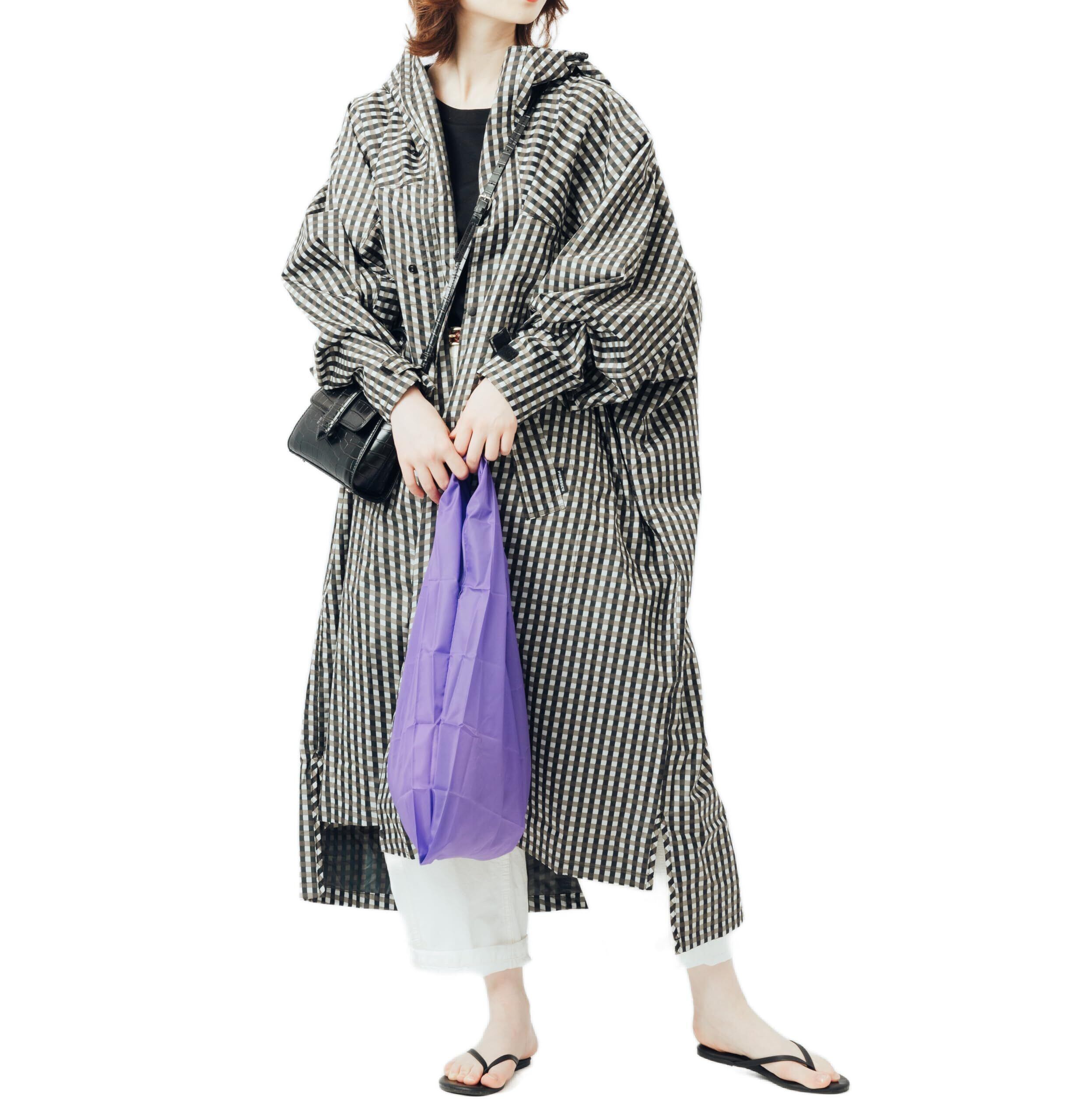 フルオープンできる前開きファスナーを設置し、脱ぎ着を楽にしました。ゆったりの身幅でリュックを中に背負うこともできるので、急な雨でもさっと着用が可能です(バッグの大きさによっては着用できない場合もございます)。持ち運びに便利な収納袋付きです。