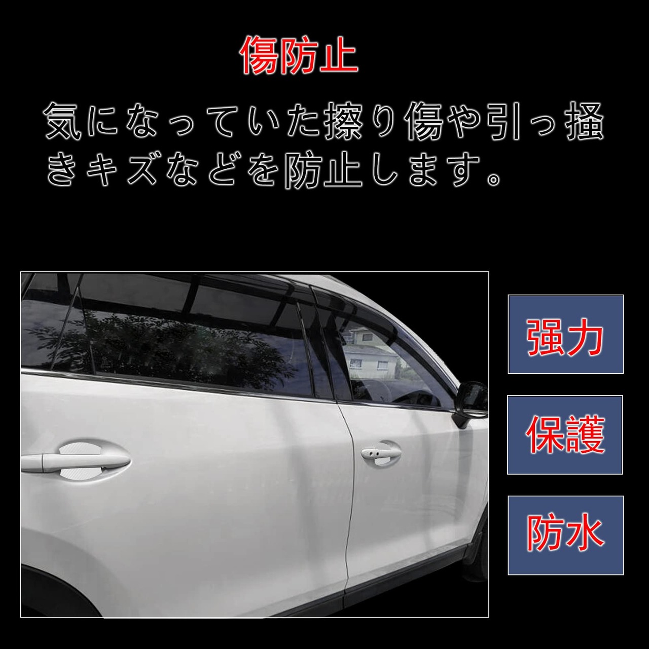 ●商品利点:気になっていた擦り傷や引っ掻きキズなどを防止します。装着の後、ドアハンドル保護フィルムは 指輪などによる傷を防止することで、大切なご愛車をしっかり守ります。