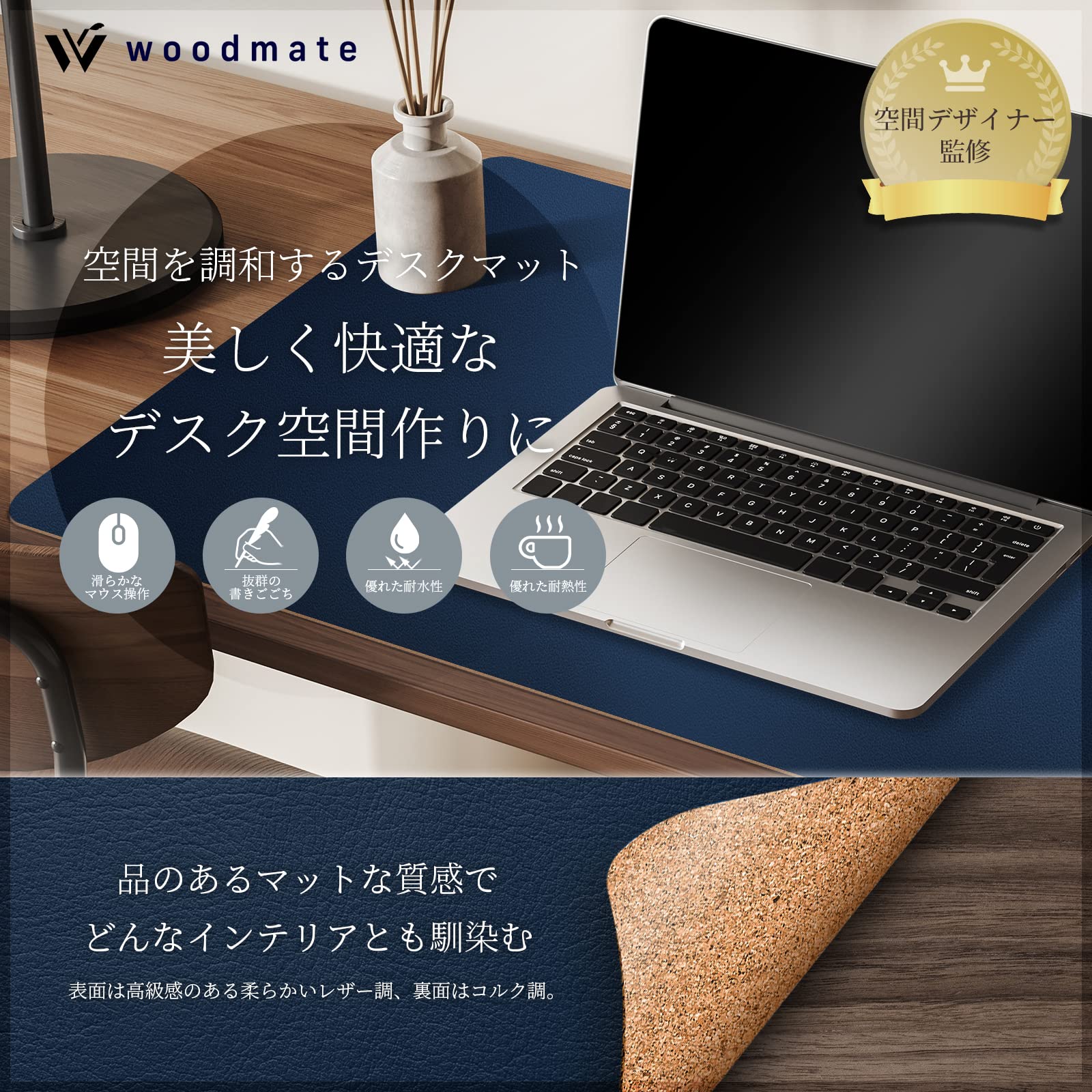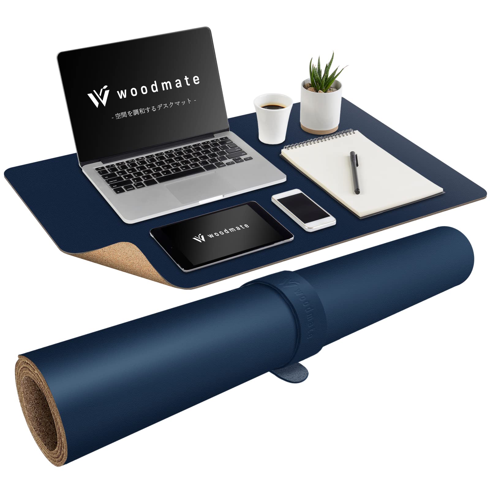 Woodmate 空間を調和するデスクマット 『空間デザイナー監修』 レザー 裏面コルク デスクパッド (ダークブルー 60cm × 35cm)