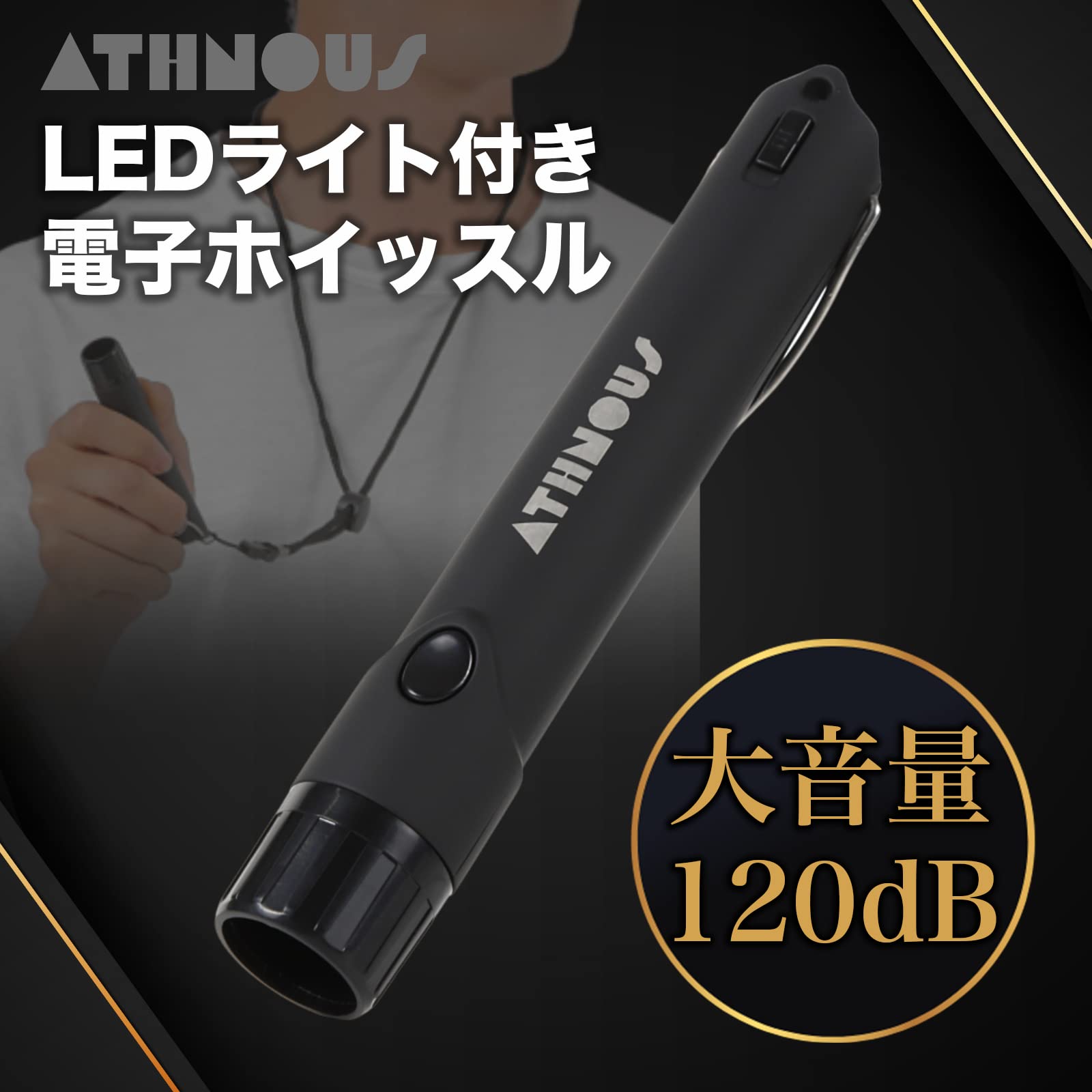 ATHNOUS(アスナス) 電子ホイッスル 防水 防災 防犯 熊除け 超軽量 大音量 コンパクトデザイン 害獣除け 審判 登山 キャンプ LEDライト付き 2回分の電池付属 ネックストラップ付属