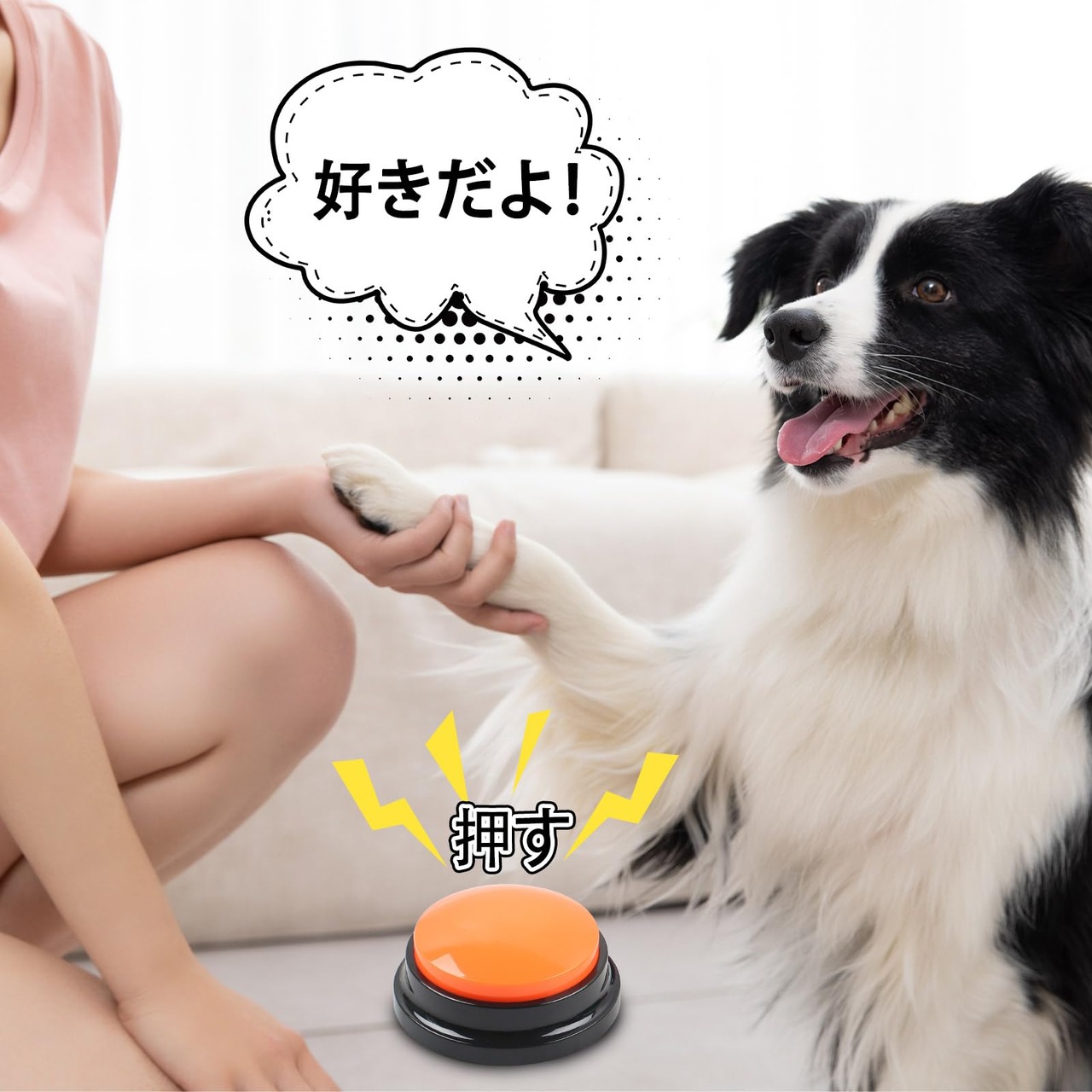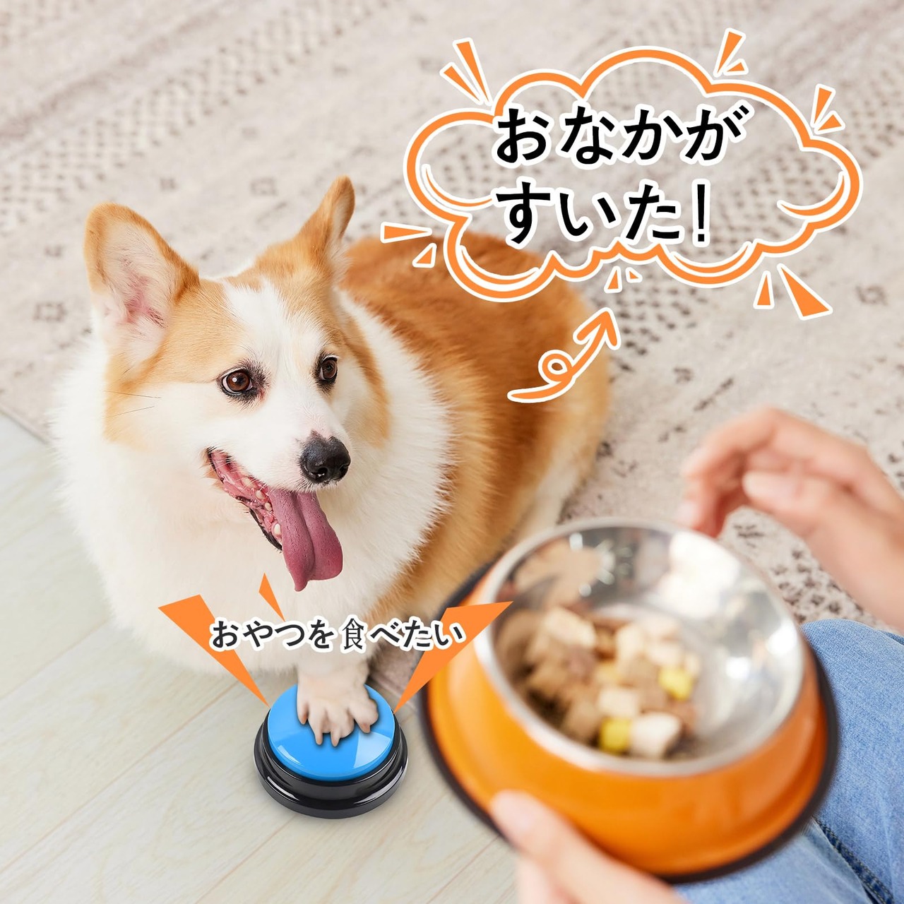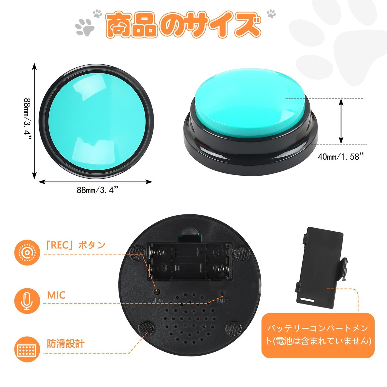 【30秒録音】:カスタム録音ボタンでお好みの音を録音できます。例えば「食べる」、「飲む」、「出る」、「はい」など、ペットとの会話を実現します。