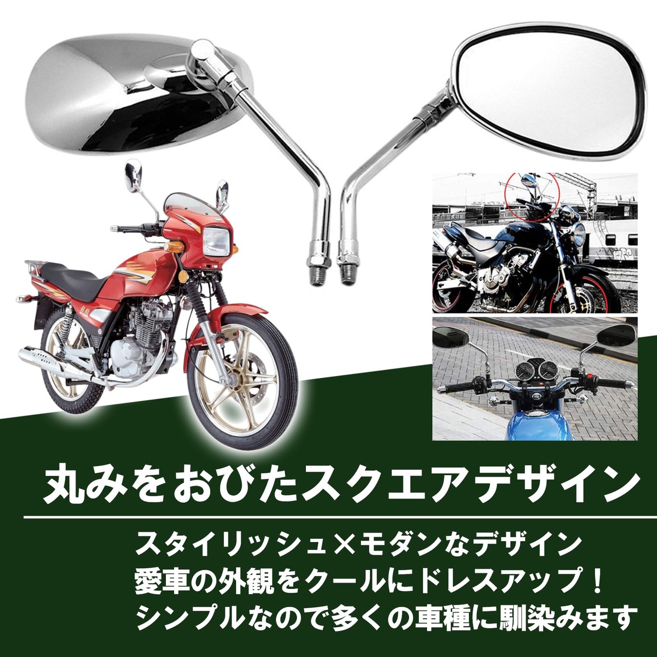 汎用 丸み スクエア型 バイクミラー メッキ加工 正ねじ 10mm 左右セットです。