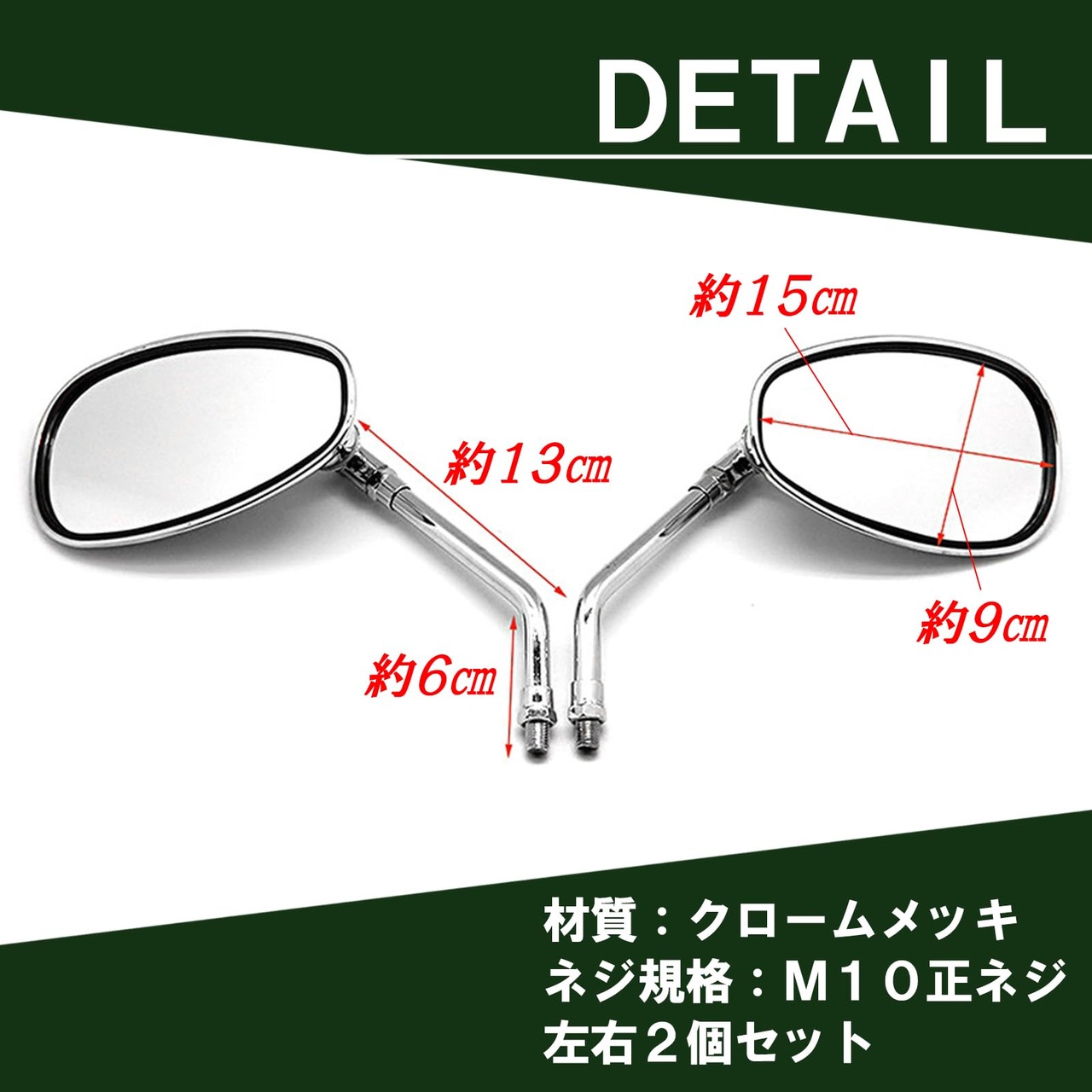 【サイズ】ミラー部分(1番長い部分):縦9cm×横15cm、【ネジ規格】M10正ネジ(10mm)、【重量】約510g/個、【素材】クロームメッキ、【バリエーション】左右2個セットと左右2個セット×2(合計4個)の2種類よりお選びいただけます。