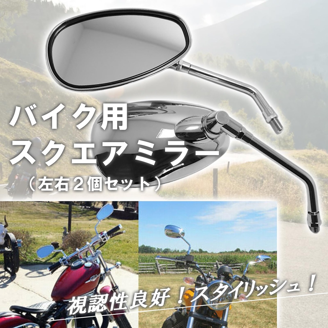 【数量限定】karim バイク ミラー スクエア 角型 メッキ 10mm 汎用 正ネジ 左右 2個 セット オートバイ スタンダード ハンドル 鏡 四角 シルバー クラシック (1)