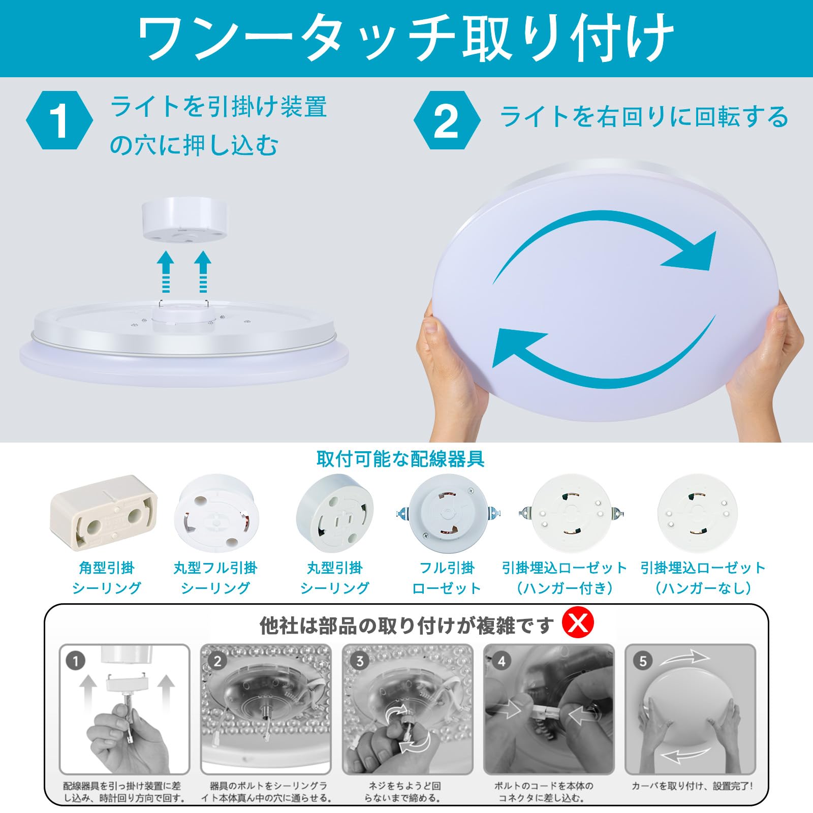【取付簡単】このLEDシーリングライトは工事不要で、簡単に取付できます。説明書に記載である取付方法によって女性でも簡単に扱えます。コンパクト、軽量なシーリングライト、天井に対応な配線器具がある場合、電気工事・工具不要で簡単に取付できます。ご注意:未然に感電による外傷や障害の発生を防ぐため、取り付け/取外し前に電源をお切りください。