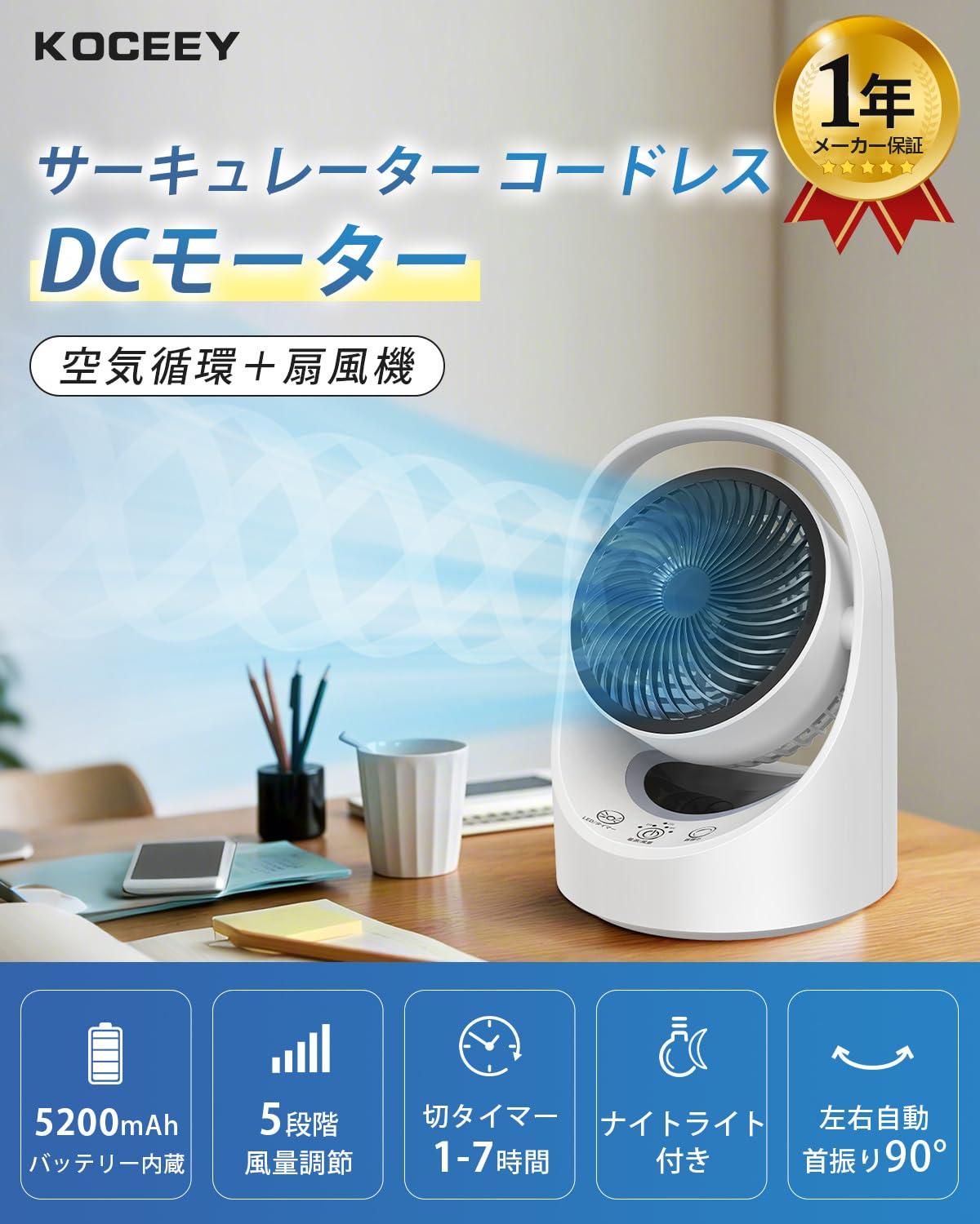 サーキュレーター コードレス 充電式 扇風機 兼用 DCモーター 静音【節電対策&最大25時間運転】USB 5200mAhバッテリー パワフル送風 5段階風量調節 左右首振り 上下角度調節 1-7時間切タイマー 省エネ コンパクト 小型 ライト付き アウトドア用/キャンプ用/車中泊/換気/空気循環/部屋干し/衣類乾燥/梅雨除湿/冷房/暖房 日本語取扱説明書付き
