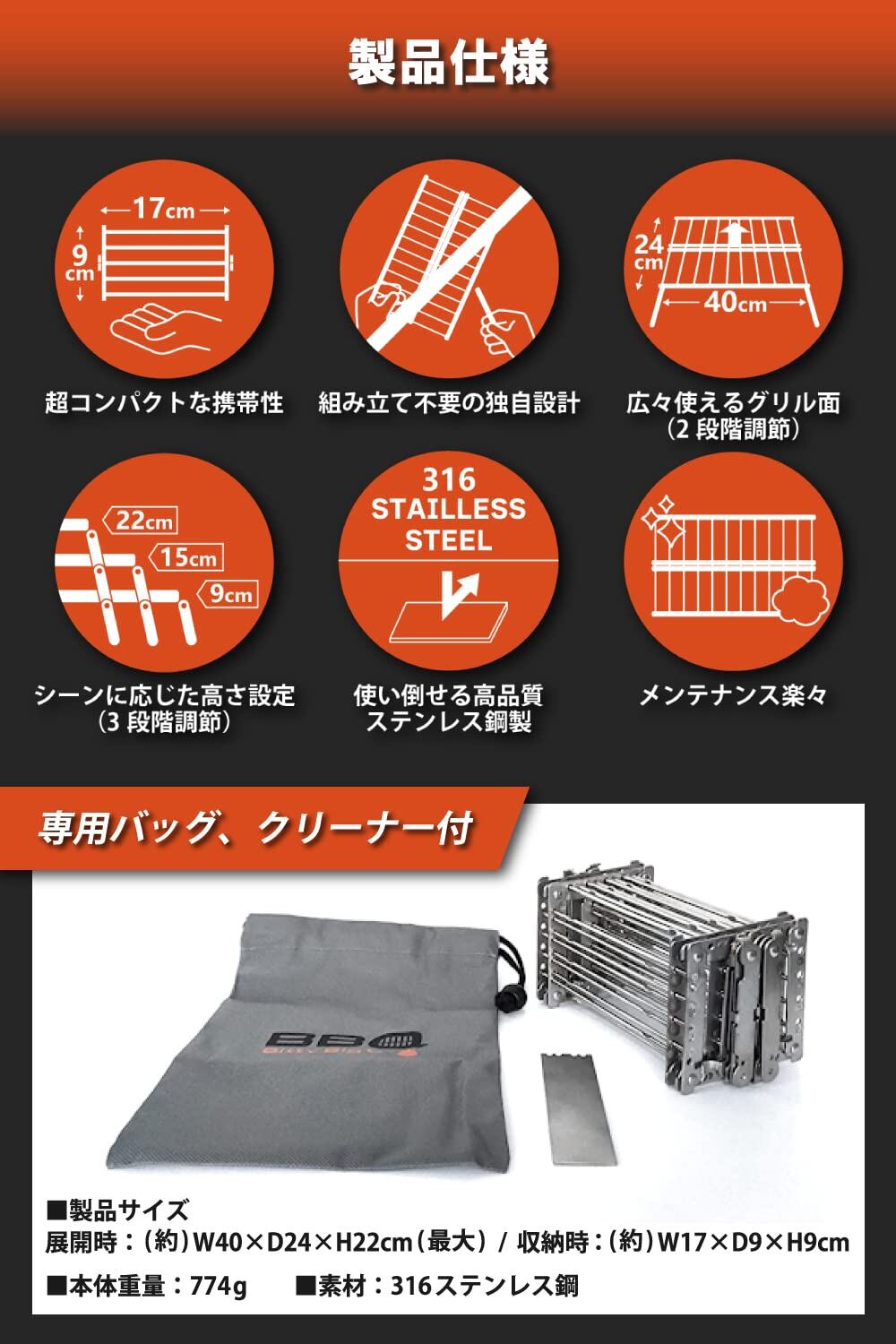 【専用バッグ付き】丈夫な専用バッグでさらに持ち運びやすく! 【安心の正規代理店保証付】 ▼安心の日本総代理店保証付。(並行輸入品や海外セラーの転売品にはご注意ください。 【スペック詳細】 ▼製品サイズ 展開時(約)W40×D24×H22cm(最大) / 収納時 :(約)W17×D9×H9cm ▼グリル面サイズ 1段階目:(約)37×15cm / 2段階目:(約)37×24cm. ▼脚部高さ 1段階目:9cm / 2段階目:15cm / 3段階目:22cm ▼本体重量:774g ▼素材:316ステンレス鋼