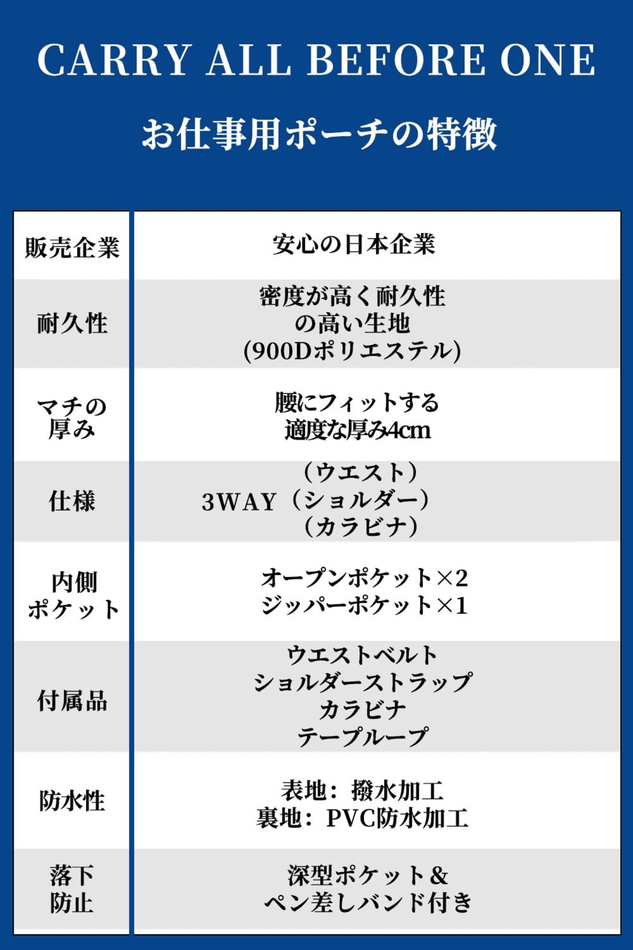 ■【ズレ落ちにくいマチ幅4(2+2)cm】ポーチのマチ幅は、ズレ落ちにくく動きやすい4cm。(メインポケットのマチ2cm、フロントポケットのマチ2cm)■【3WAY仕様】ウエストバッグ用と斜め掛け用の2種類のベルト、カラビナ付きで、お好みのスタイルで使い分け。ウエストベルト、ショルダーベルトは共に120cmまで調整可能。ベルト通し部分は外れにくいよう縫製を強化しました。■【多数の便利機能】Dカン、カラビナ、テープループ、ボタン式ループ、ナスカンフック、ウエストベルト、ショルダーベルトが付属。フロントポケット内部には、ゴム生地のペン差しバンドが付き、小物の落下を防止。ウエストベルトは縫い付けられた固定タイプではなく、ポーチの位置を自由にスライドできる仕様です。