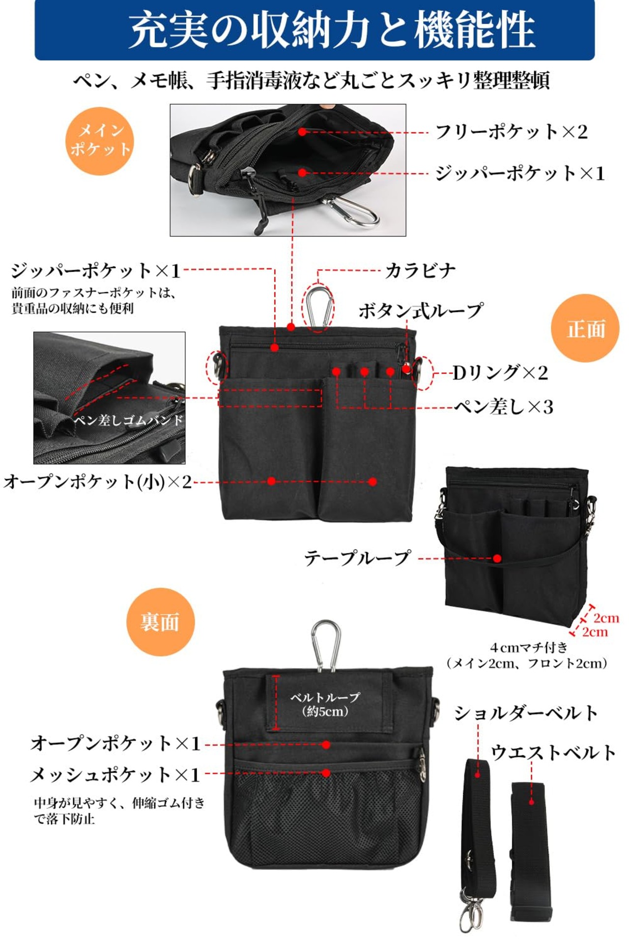 [CARRY ALL BEFORE ONE] 3WAY 多機能ウエストポーチ ナースポーチ マチ付き 9ポケット 作業ポーチ 仕事用ウエストバッグ カラビナ ウエストベルト ショルダーベルト ペン・文具差しバンド付き 撥水 防傷加工