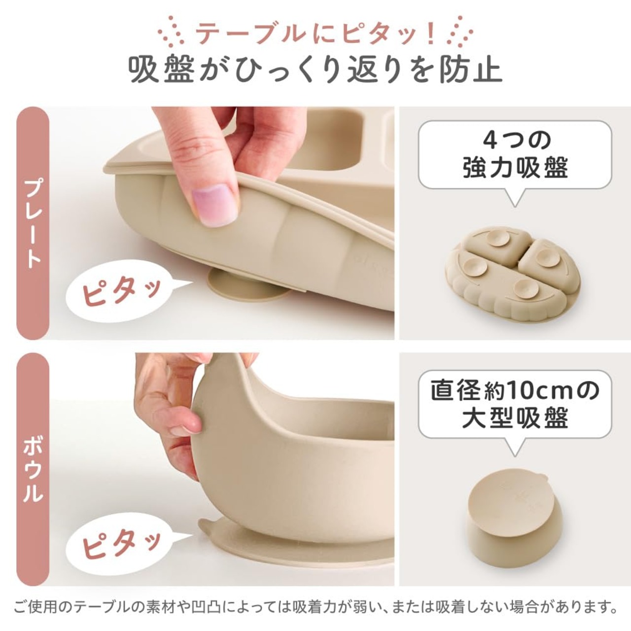【食育アドバイザー監修】ひっくり返らないベビーシリコン食器4点セット。吸盤付きのかわいいプレートやボウルなど食事に必要なアイテムをセットでお届けします。