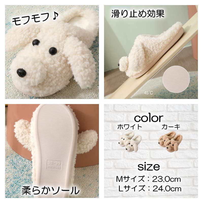 ・もこもこカワイイ、プードルみたいなルームシューズ ワンちゃん大好きなペットファン必見の一押しアイテムです。 ・脱ぎ履きしやすいスリッパタイプ 肌触りもやわらかくて気持ちいい 素足に履きたい気持ちよさです。 ・テレワークにより家での作業が増えても、かわいいプードルスリッパに癒されてストレス緩和できます。オフィスやテレワークの冷え性対策にもおススメです。 ・ボア素材なのでふわふわが気持ちいい。癒しのルームシューズでおうちリラックス。ご自宅用にはもちろん、ご家族様、お客様用にもおススメです。 ・サイズ:Mサイズ 約23.0cm Lサイズ 約24.0cm