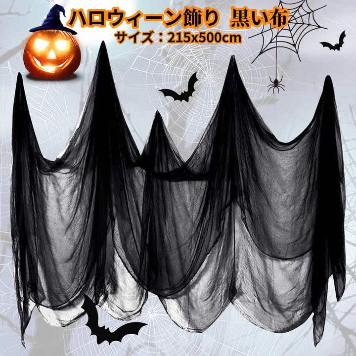 KINGOKU ハロウィン 飾り 黒カーテン 不気味 ハロウィーン 装飾 布 簡単 テーブルクロス 215×500cm お化け屋敷 怖いガーゼ布 玄関 屋外 壁飾り パーティー 仮装 道具 (黒カーテン)
