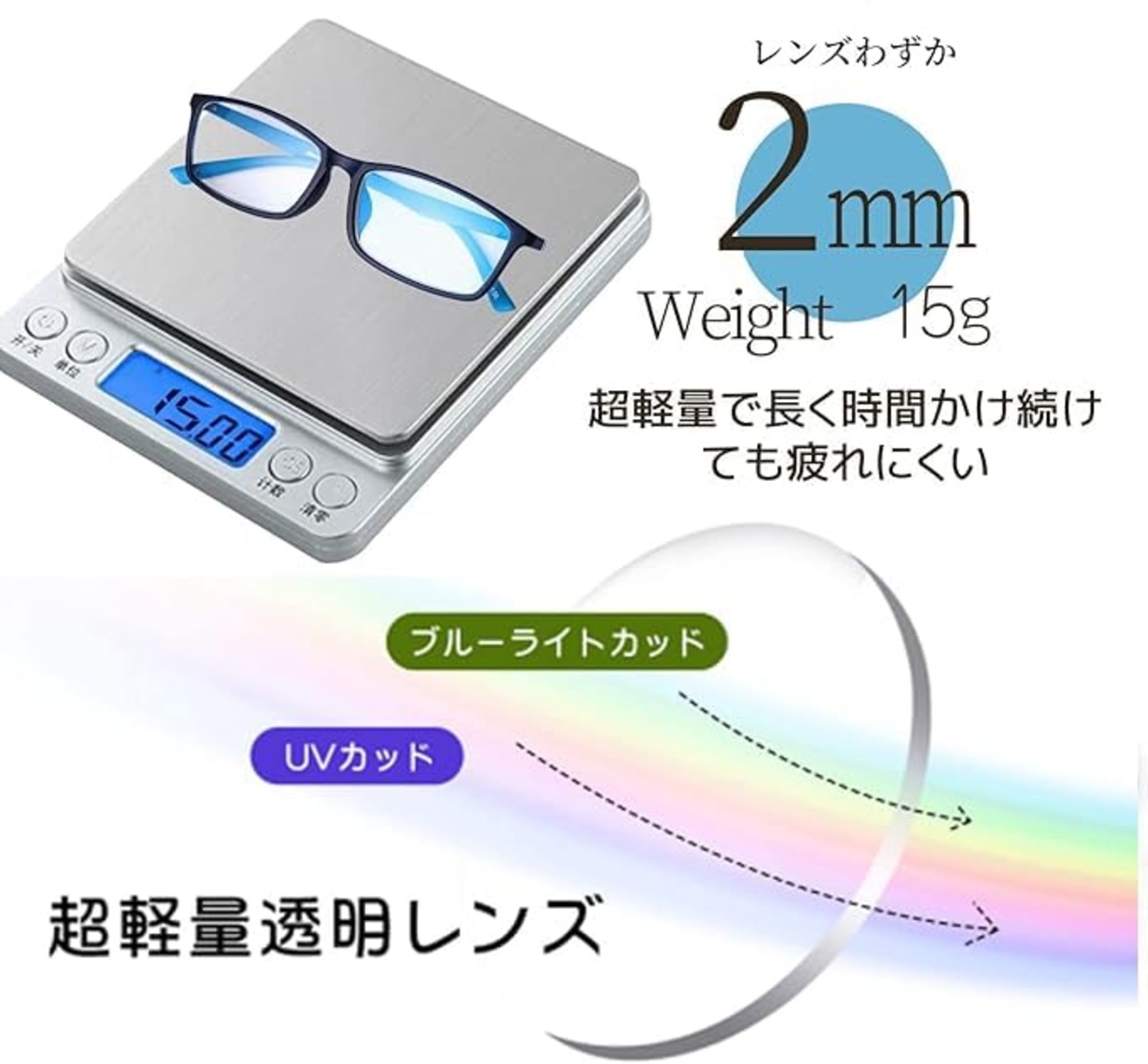「ブルーライトカット&UVカット」ブルーライトの中でも特に強いHEV光線は睡眠障害や目の老化など眼疾患の原因といわれており、この老眼鏡はブルーライトを45%カットします、効果的に目の疲れを緩和し、視力を保護し、睡眠の質を向上します。おしゃれさだけでなく実用性もPC・スマホを長時間使用する人に。