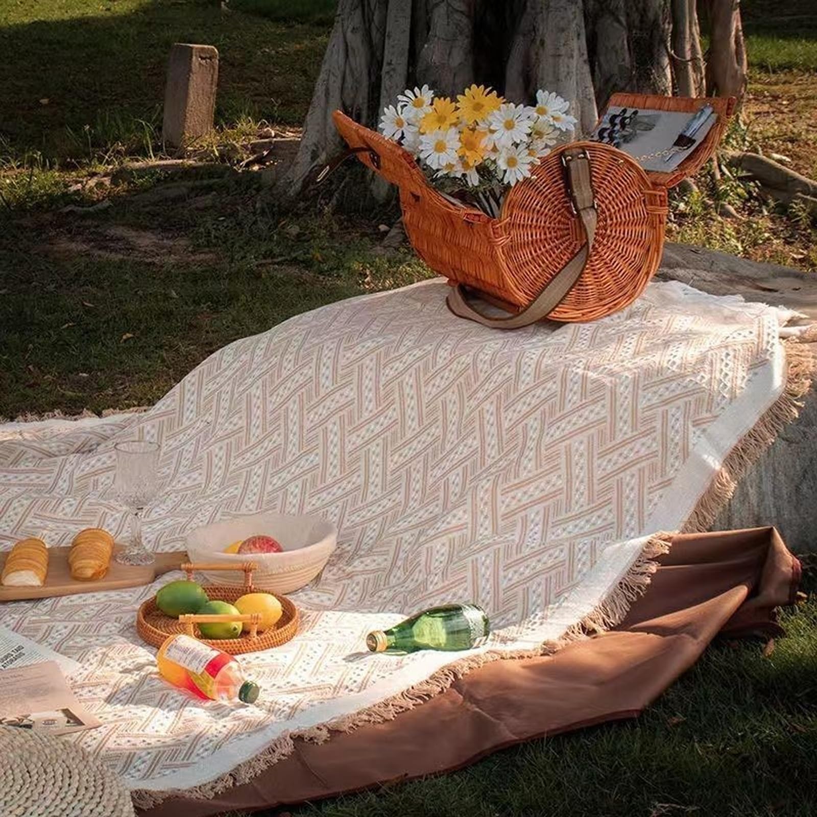 おしゃれなピクニックシートは、芝生やビーチでも活躍する万能アイテムです。花見や遠足、キャンプでの利用に最適なシンプルなデザインで、家族や友人との素晴らしい時間を過ごせます。
