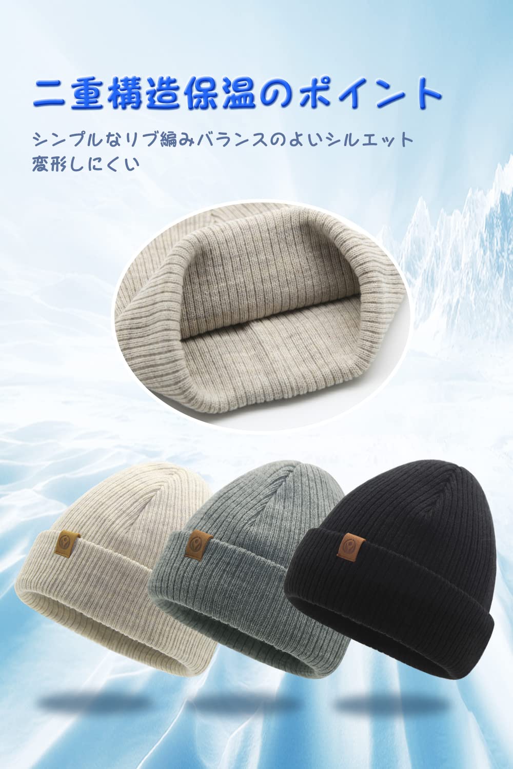 二重構造、保温性・防寒性に優れたニット帽です。