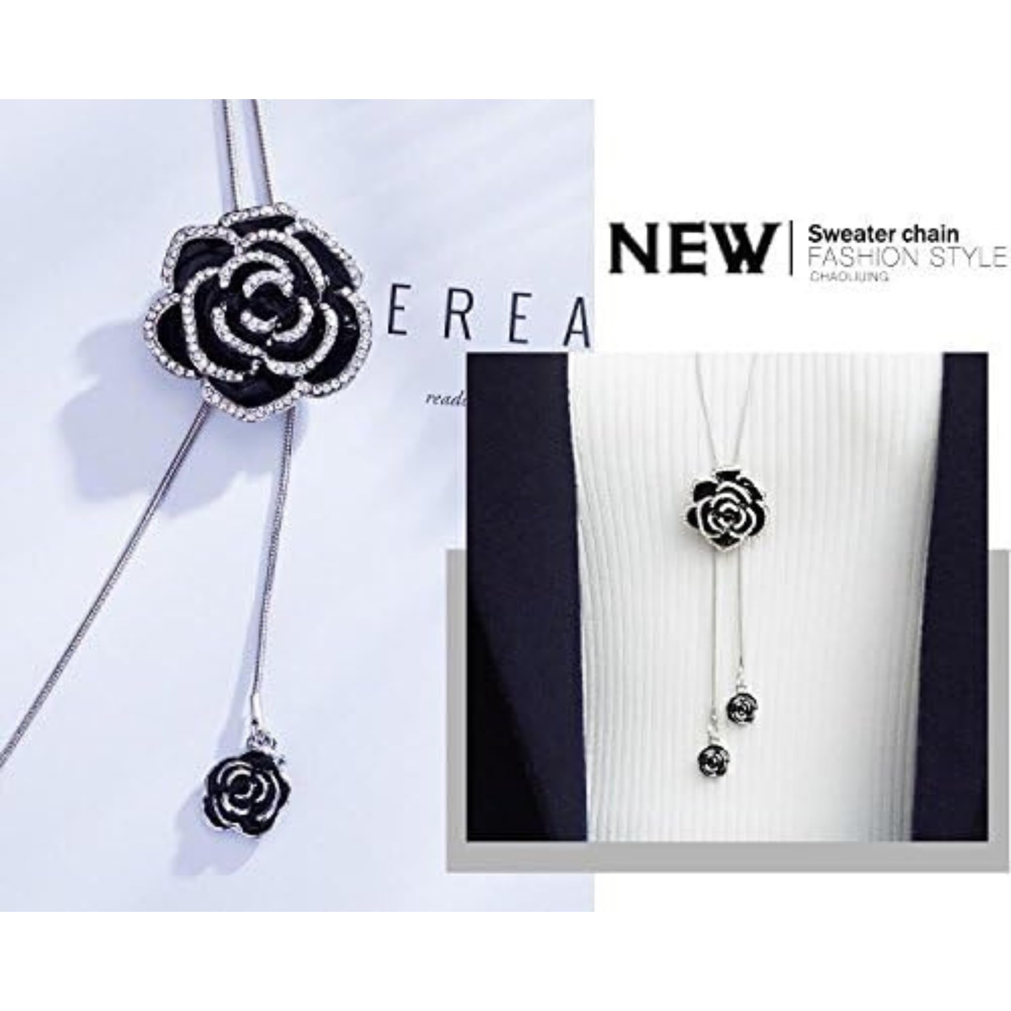 エレガントな黒薔薇をあしらったロングネックレス。トップとチャームの黒薔薇が高級感のあるデザインです。