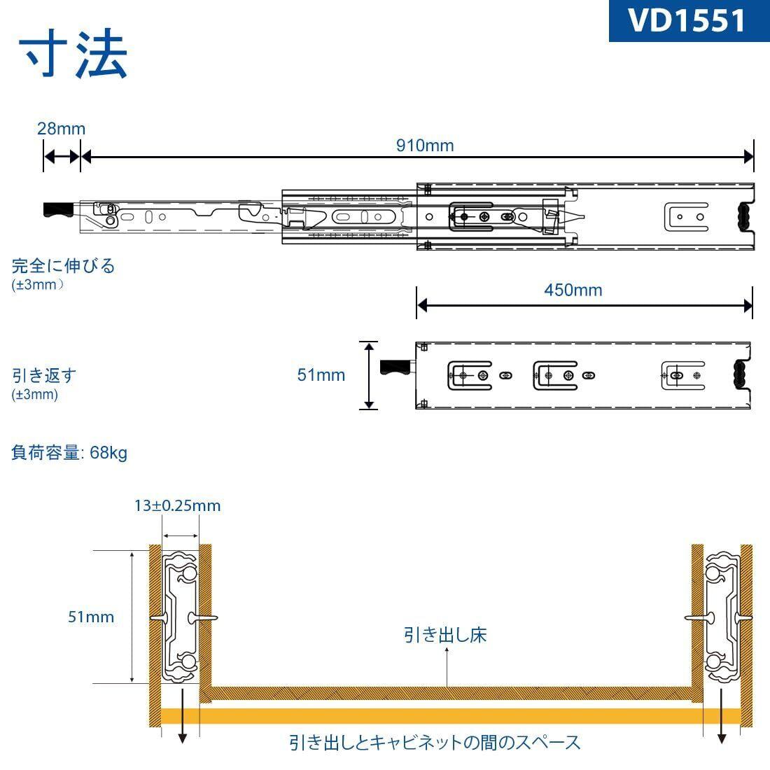 【2022最新】VADANIA VD1551 重量用スライドレール ロック付き 3段引 フルエクステンション ボールベアリング 横付き 引き出し用レール 450mm 左右1セット(2本入) | libertyislan