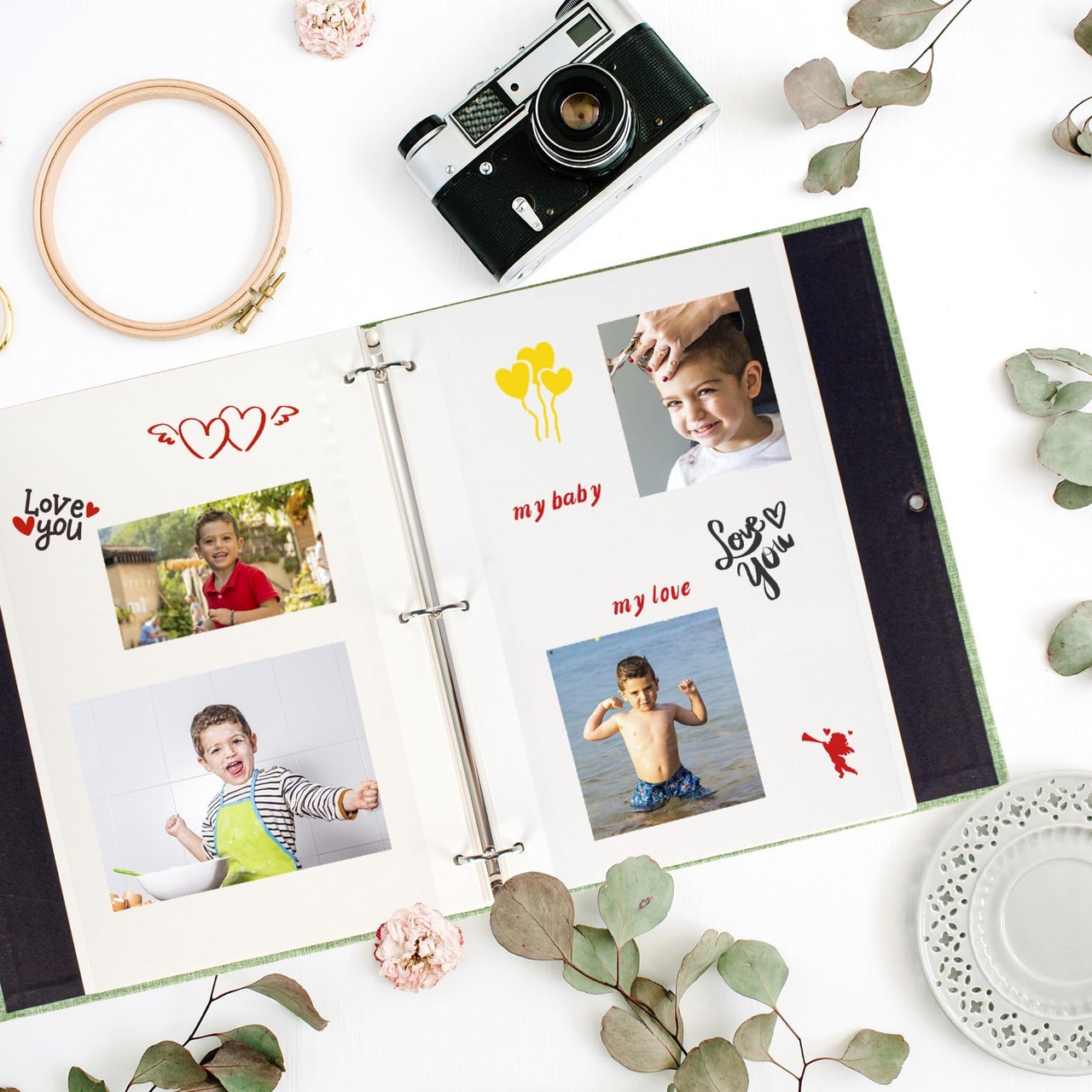【粘着式アルバム】粘着性があるフリー台紙だから、Lサイズ、2Lサイズ、KGサイズなどのサイズ違いの写真を1ページにまとめて整理できます。粘着式のアルバムであれば、マスキングテープやメモなども自由にはさむことができるので、子供の成長記録、家族の思い出をオリジナルのデザインで鮮やかに彩ることができます。