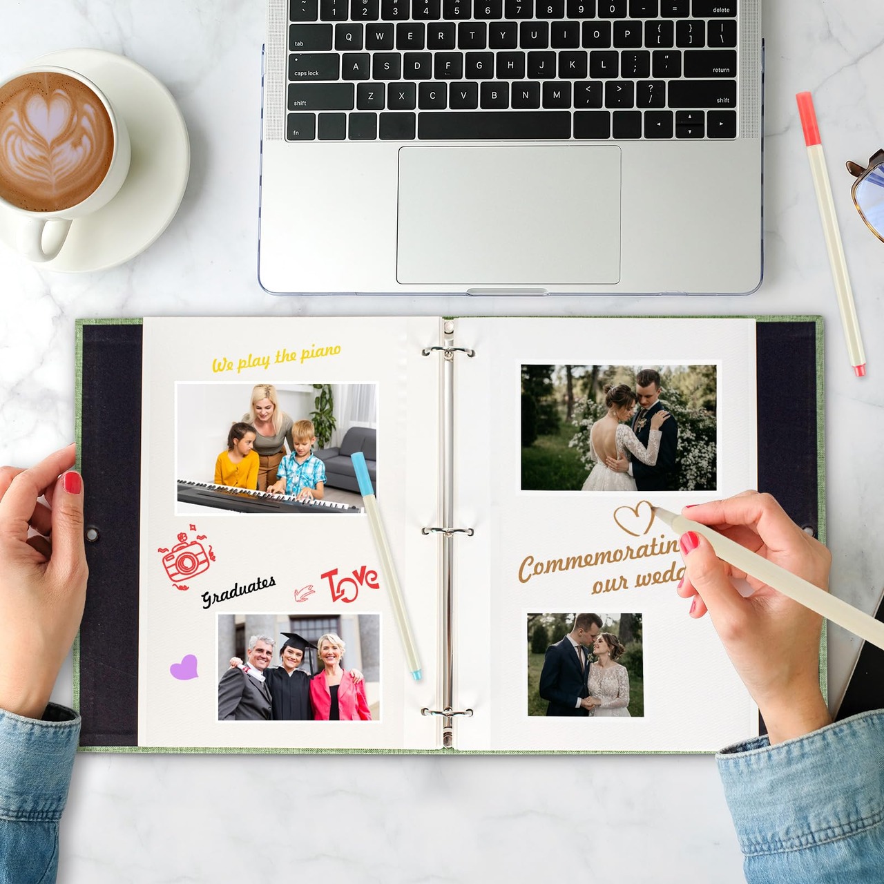 【バインダー式】しっかりした厚手のフリー台紙を使用して、写真のレイアウトが自由にでき、何度でも張り直せる点が魅力です。3穴のバインダー式なので、台紙の移動が便利で、素材の量に合わせて自由に増減することができます。また、シールやカラーペンを付けて、お好みに合わせて自由に飾り付けができますので、お楽しみください。