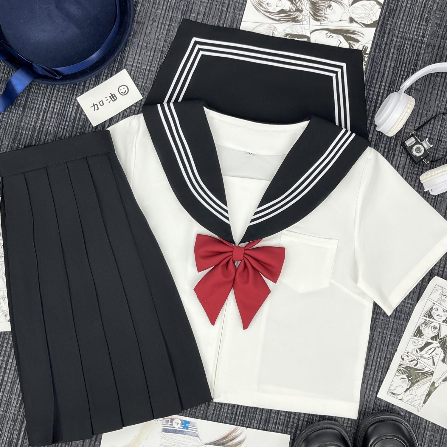 【商品内容】セーラー服トップス、ショートスカート、同色の蝶ネクタイ、ストッキング。定番のセーラー服のフルセットです。長袖と半袖があり、一年中着用できます。 前開きタイプで着脱も簡単、本格的な女子高生制服、JKロールプレイングに最適!