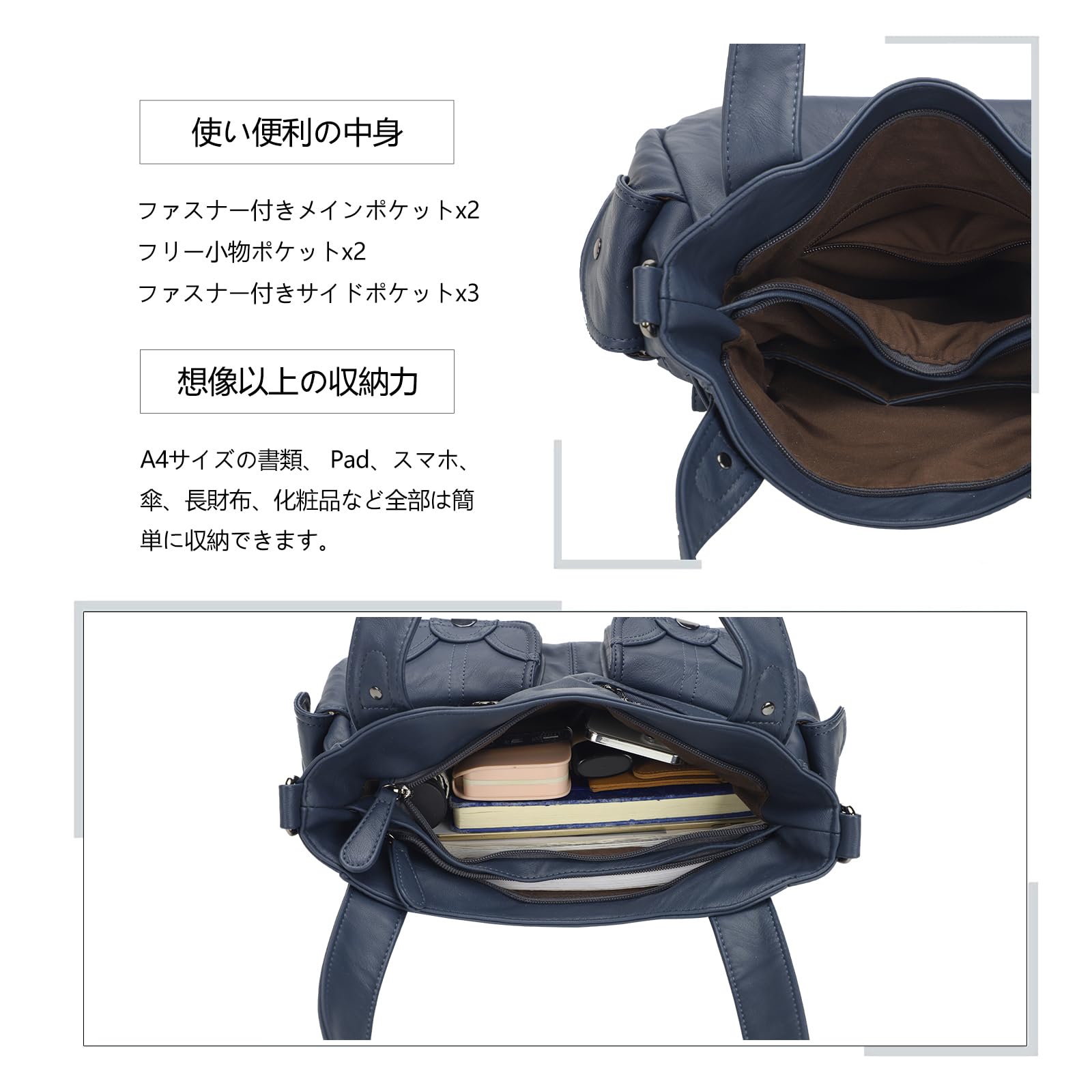 見た目以上の収納力:A4サイズの雑誌、スマホ、iPad、折り畳み傘、サングラス、化粧品、財布など、大容量のバッグで十分に入ります。二つのファスナー付きメインポケット、三つのファスナー付き小物ポケット、四つマグネットボタン付きフリーポケットでショルダーバッグをスッキリと整理整頓しながら収納スペースも確保できます。