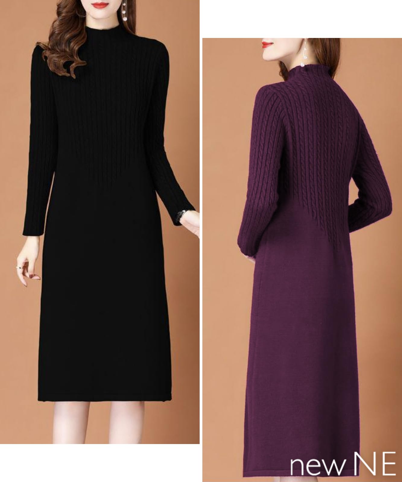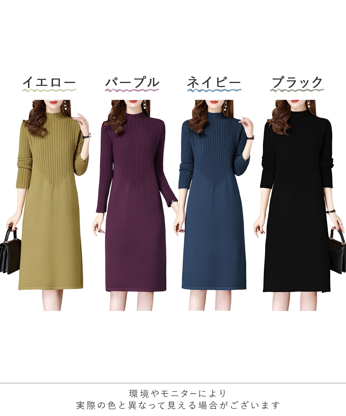 [newNE] 【在庫限り】ニットワンピース ケーブル編み 風 ミディ丈 長袖 無地 シンプル エレガント おしゃれ 通勤 秋冬 レディース