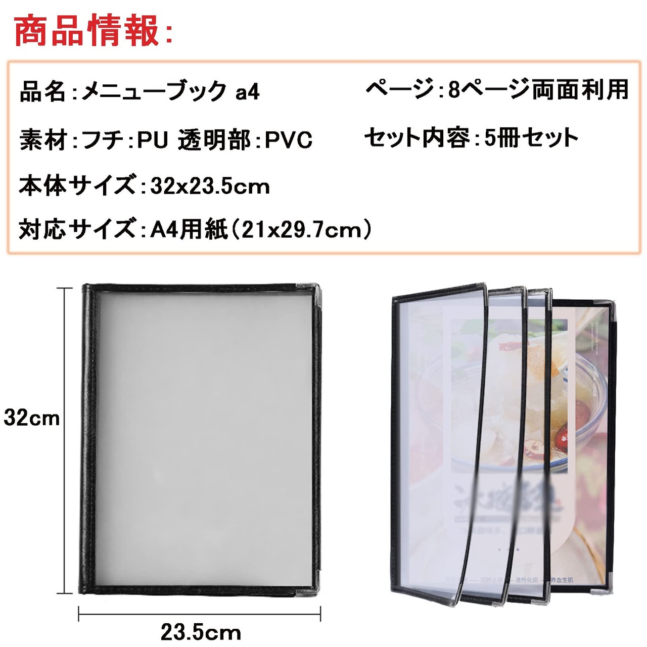 Ailenlan a4 メニューブック メニュー表 a4 5冊セット メニューファイル メニューブック a4 4ページ 両面利用 menu book A4サイズ対応 4ページ 透明 料理写真8枚入り