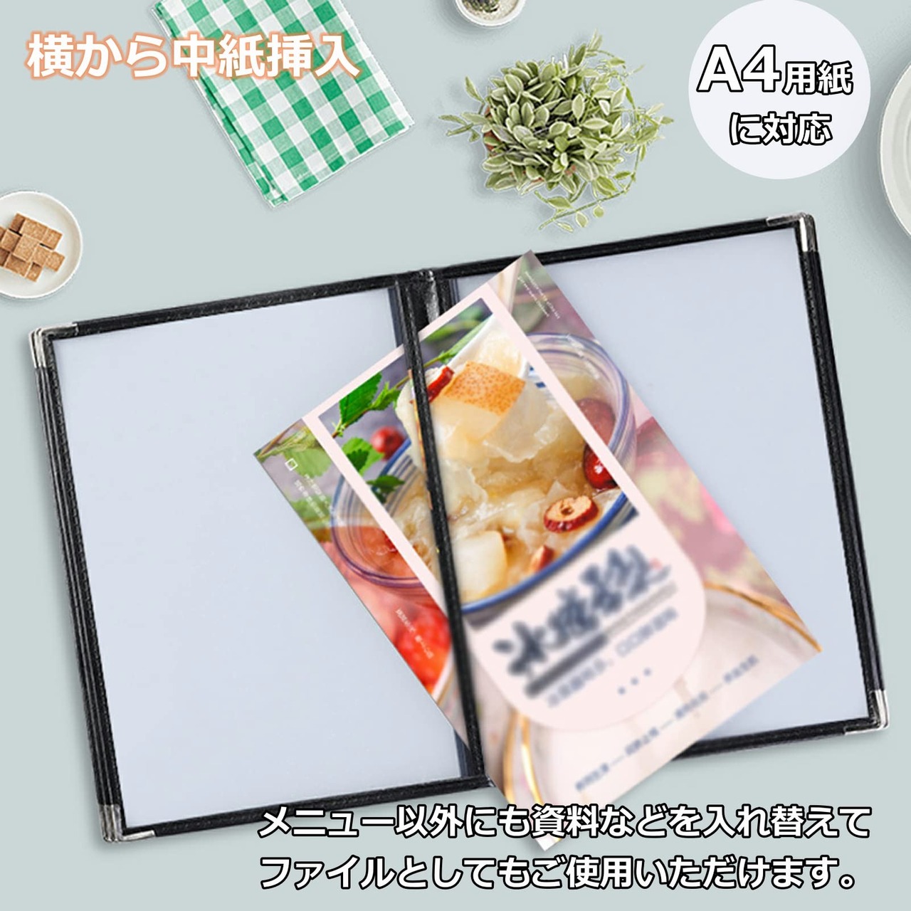 A4サイズの用紙を横からスライドして差し込いむ。飲食店、レストラン、カフェ、喫茶店など大活躍してくれるメニューブック a4です。メニュー以外にも資料などを入れ替えてファイルとしてもご使用いただけます。