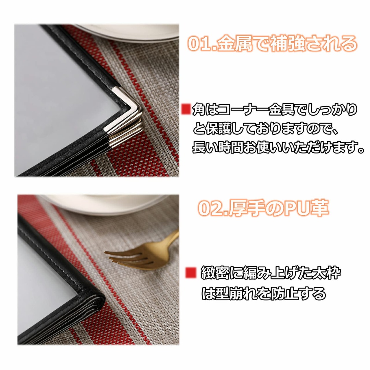 a4メニュー表の四隅は金属で補強されており型崩れを防ぎますので、長い時間お使いいただけます。スタンドタイプとしても使用可能。