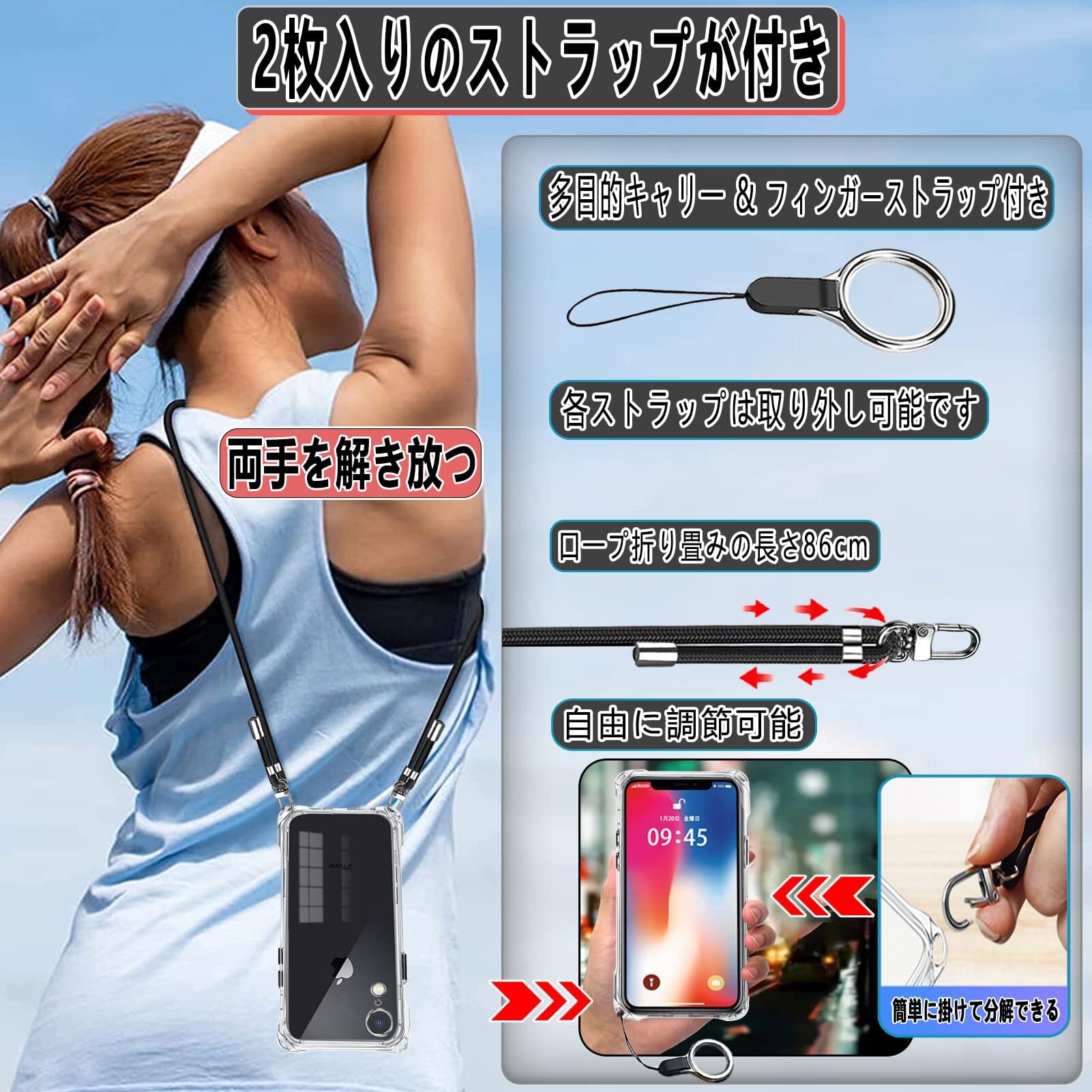 【ストラップ2枚付き & 両手を解き放つ & 調整も簡単】本iPhone XR ケースにはフィンガーストラップとネックストラップが付属します(フィンガーストラップ長さ:10cm、ネックストラップ装着時の最大調整長:86cm。)電話ケースの特別な四隅のデザインにより、電話を縦または横に肩に掛けることができ、ストラップはいつでも調整および取り外しできます。このアクセサリーはファッションだけでなく、通常のストラップよりも快適で実用的です。 作業、旅行、出張、ショピング、散歩、コンサート、パーティーに最適です。(あなたは受け取るでしょう:1x iPhone XR用 ケース + 1x フィンガーストラップ+ 1x ネックストラップ)