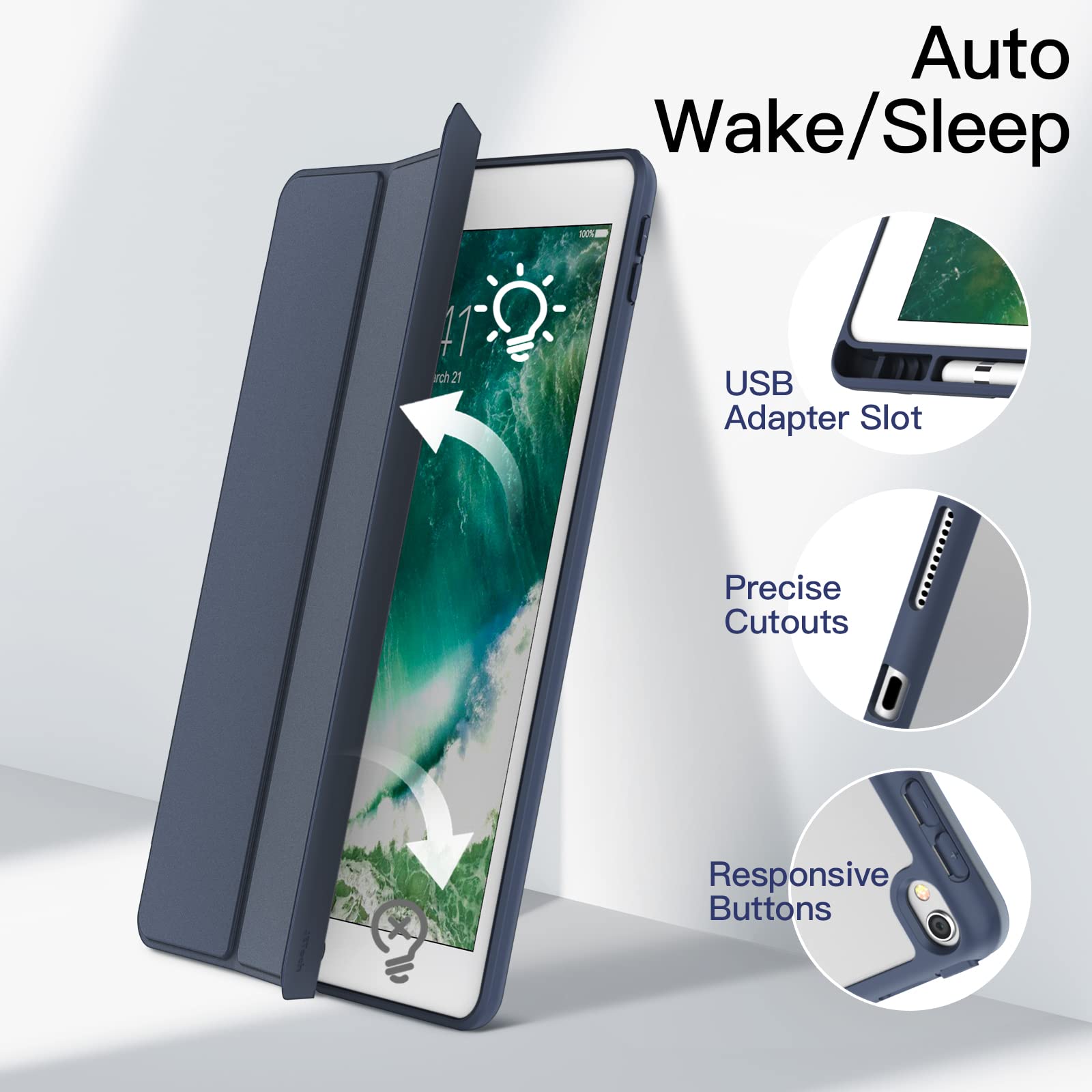 [精確なカットアウト] マグネット式スマートカバーは自動スリープ/ウェイク機能をサポートできます。完璧に整列されたカットアウトにより、スピーカー、ボタンと他のポートに完全にアクセスできます