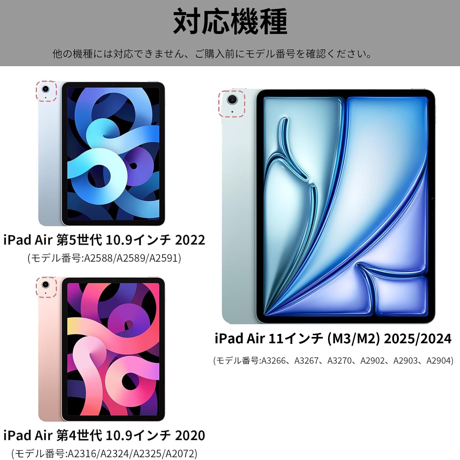 対応機種:iPad Air 11インチ ケース M3/M2 (2025/2024)/iPad Air 第5/4世代 (2022/2020年)10.9インチ、(モデル番号:A3266/A3267/A3270/A2589/A2591/A2588/A2324/A2072/A2316/A2325/A2902/A2903/A2904)。 他のモデルには対応しません。 ご購入前にモデル番号をご確認いただきます。