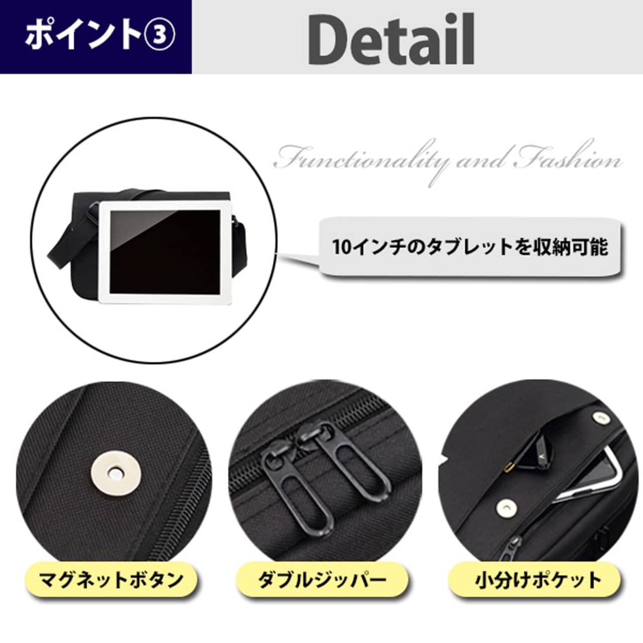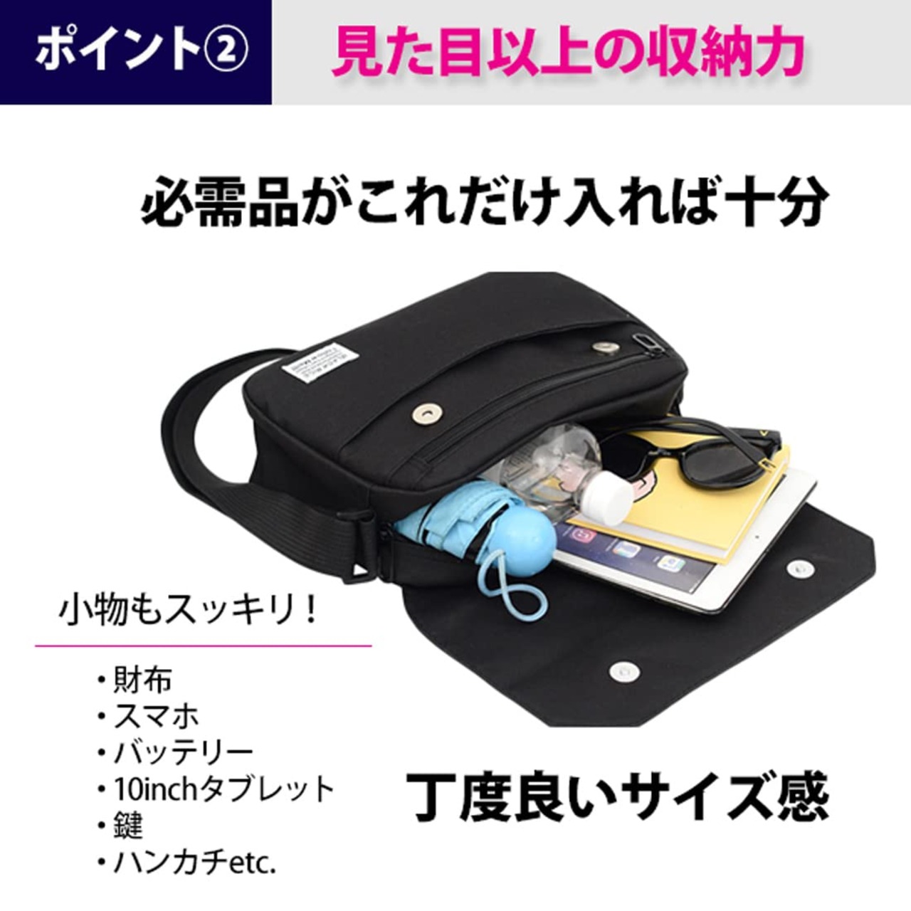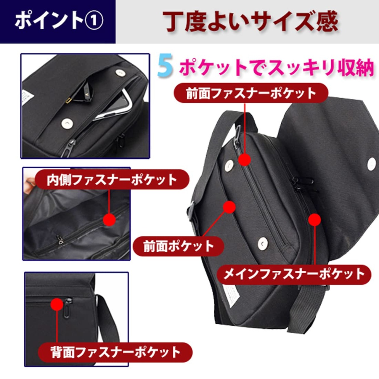ジャストサイズで収納便利なショルダーバッグ! メッセンジャーバッグ だと大きく、ボディバッグ では小さいという方にも最適使いやすく便利な5つのポケットですっきり収納! 財布、スマホ、鍵、ハンカチ、タブレット、モバイルバッテリーなどを整理整頓 必需品がしっかり入って、軽量270g!