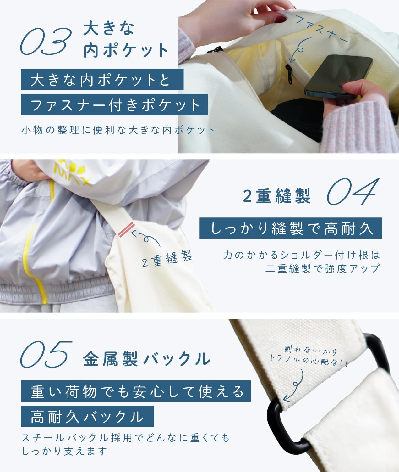 キャンバス 【徹底的にこだわった品質 】荷物が多くなりバッグが重くなっても安心「脱着可能ショルダーパッド」を付属。すぐ取りたい物を分けて収納できる「大容量内ポケット」に加え、安心の高耐久「YKKファスナー」を採用。また、強度面では安心の高強度「鉄製バックル」とショルダー付け根部への「二重縫製」で高強度を確保。 使い方のシーンにおいては、 スクールバッグ メッセンジャーバッグ エコバッグ 旅行バッグ ショルダーバッグ 、本製品1つでマルチに活躍します。