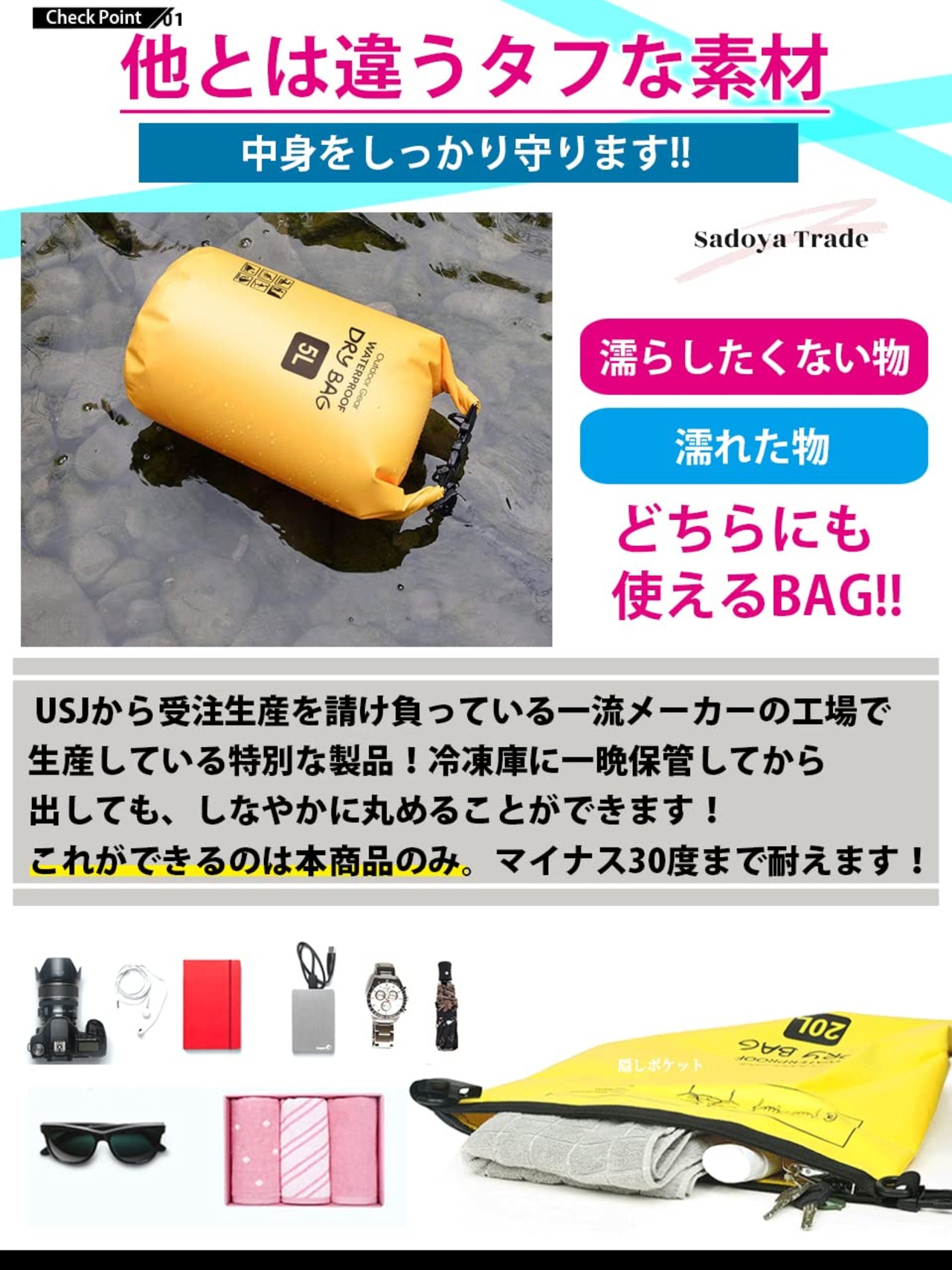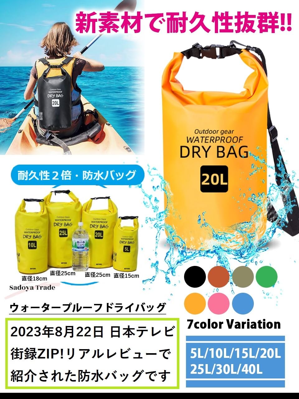 1【日本テレビ Zip!で紹介されたIPX6レベルの防水バッグ・ネームタグ付き】【自衛隊から注文される長持ちするドライバッグです】【 冬でも柔らかな素材 】【スマホポーチ付きサービスは終了しました(一部のカラー×サイズで付属する場合があります)】夏でも冬でも、海でも山でも、一年中タフに使えるしなやか防水バッグ・ドライバッグです。0.5mmの厚みの第4世代素材「Ultra-Soft Coating 500D PVC Tarpaulin」を採用。 耐久性と防水性を高めるためにダブルステッチ再成形シール付きシーム加工ですき間からの水の侵入を完全に阻止。耐久性と柔軟性を兼ね備えた商品。 ー30℃~70℃までしなやかさを確保。 耐久年数2年間という堅牢さを実現。 ヘビーデューティに防水バッグをお使い頂きたい方には最適な商品です。 本商品は、雨、雪、ほこり、砂に対してお客様の荷物を安全にドライに保ちます。【サイズ豊富】5L、10L、15L、20L、25L、30L、35L、40L _ _